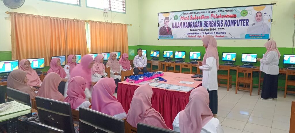 Padang, Humas – Dalam rangka memastikan kelancaran pelaksanaan Ujian Madrasah Berbasis Komputer (UMBK), Kepala Madrasah Nurhidayati, yang diwakili oleh Wakil Kepala Madrasah Bidang Kurikulum Hj. Melia S, memimpin briefing bersama para pengawas ujian pada Senin, 21 April 2025 pukul 07.00 WIB. Kegiatan tersebut berlangsung di laboratorium TIK dan turut didampingi oleh Kepala Urusan Tata Usaha, Desi Arisanti. Briefing ini menjadi langkah awal penting untuk menyatukan pemahaman dan memantapkan kesiapan seluruh pihak dalam menyukseskan pelaksanaan UMBK tahun ini.