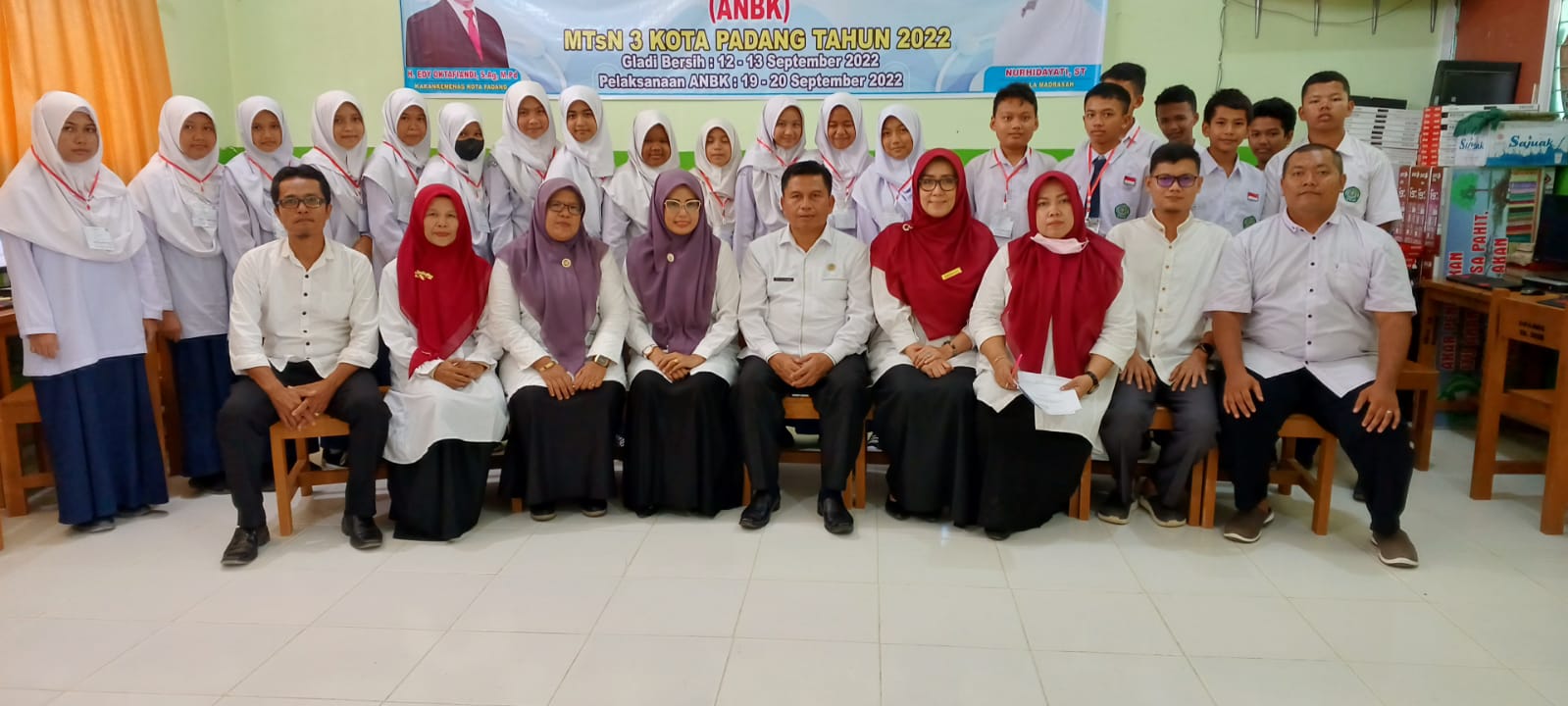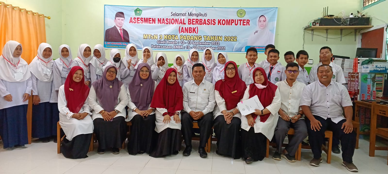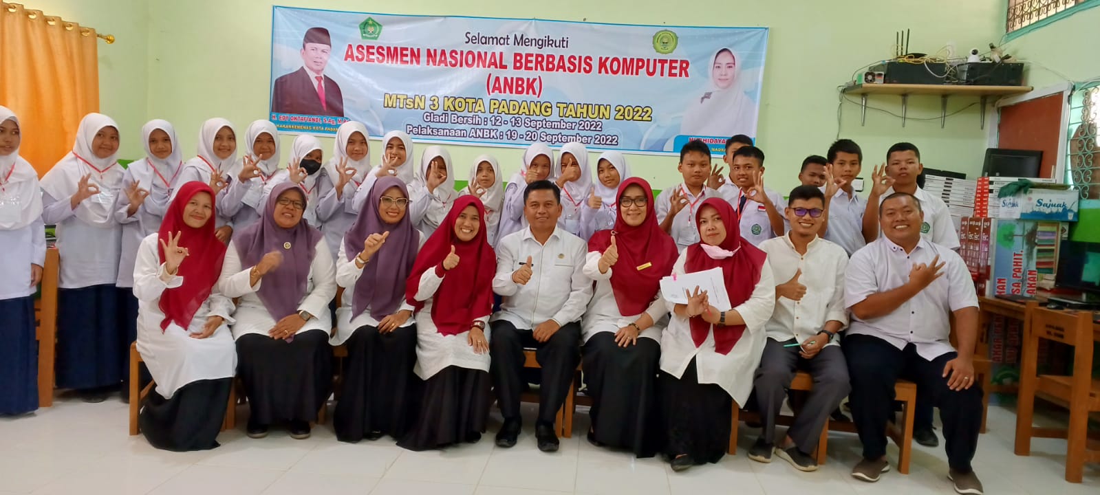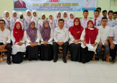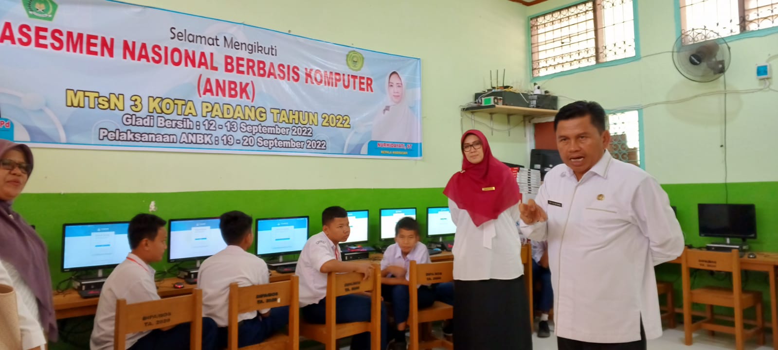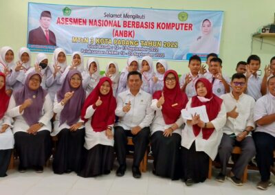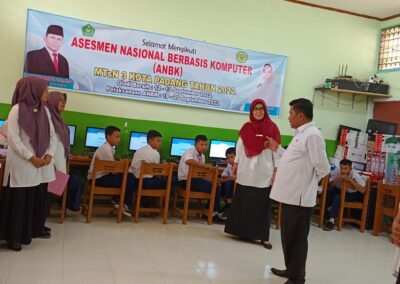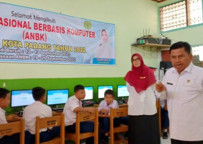 Padang, Humas – Edy Oktafiandi Kepala Kantor Kementerian Agama Kota Padang, Senin (19/09) melakukan monitoring dan evaluasi (monev) Asesmen Nasional Berbasis Komputer (ANBK) pada MTsN 3 Kota Padang. Peserta ANBK MTs diikuti oleh kelas 8 berjumlah 45 siswa dan 5 siswa cadangan yang sudah ditentukan oleh sistem pusmenjar. Setiap madrasah melakukan pembagian sesi berdasarkan komputer yang dimiliki. Bisa 1 sesi sekaligus dengan 3 ruang, atau 3 sesi karena hanya memiliki 1 ruang, per ruang ada 15 siswa.