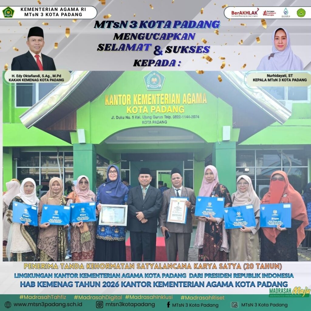 Padang, Humas — Kabar membanggakan datang dari MTsN 3 Kota Padang. Sejumlah guru dan pegawai madrasah tersebut menerima Penganugerahan Tanda Kehormatan Satyalancana Karya Satya berdasarkan Keputusan Presiden Republik Indonesia Nomor 124/TK/Tahun 2025 tanggal 01 Desember 2025 tentang Penganugerahan Tanda Kehormatan Satyalancana Karya Satya bagi ASN Kementerian Agama. Penganugerahan ini menjadi bentuk penghargaan negara atas pengabdian, kesetiaan, dan dedikasi para ASN dalam menjalankan tugasnya. Kegiatan ini dilaksanakan pada Senin (19/1) dalam suasana khidmat dan penuh rasa syukur.