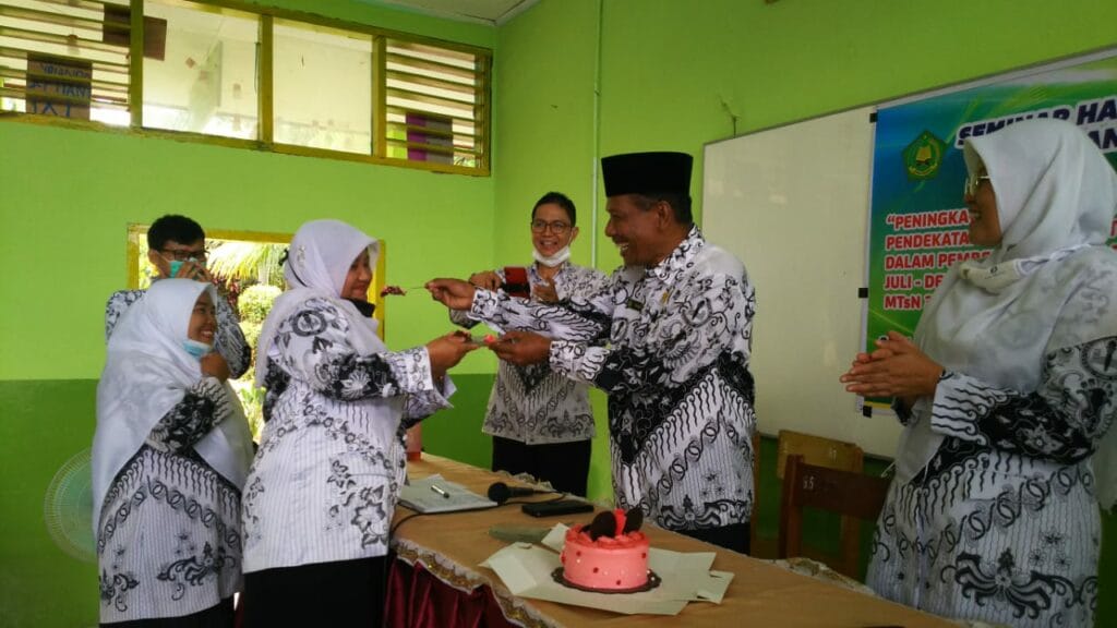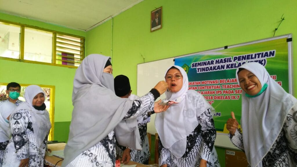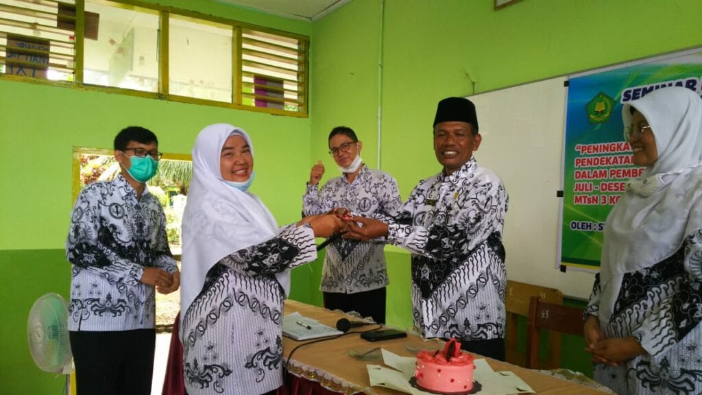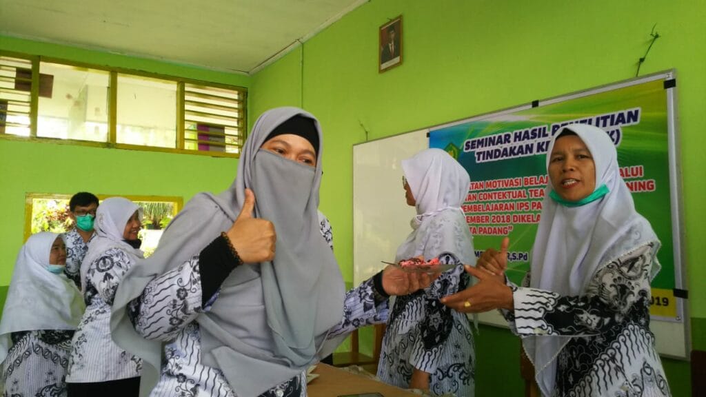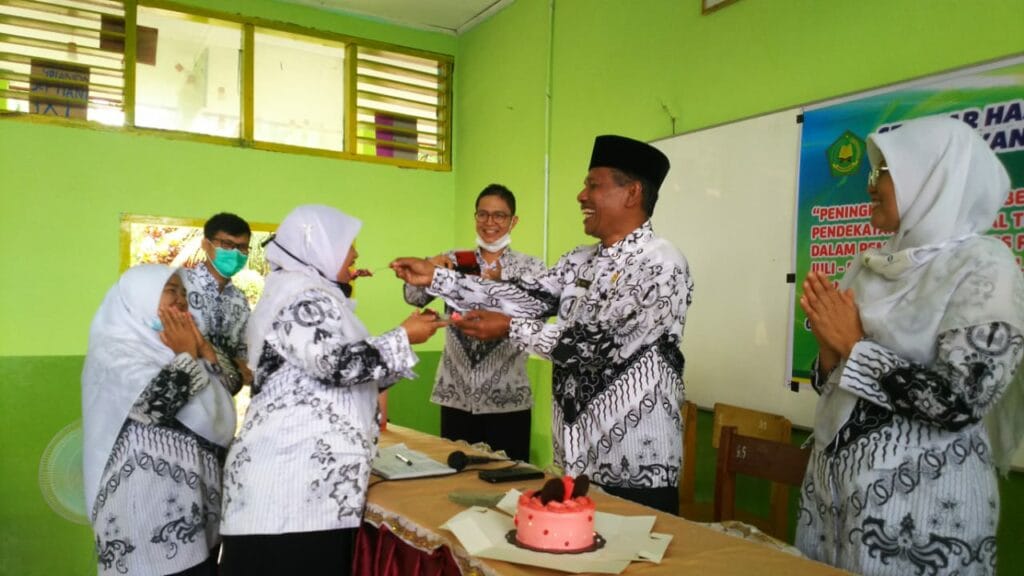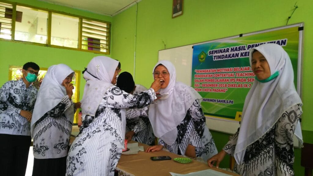 Padang – Kemeriahan HGN Tahun 2020 di MTsN 3 Kota Padang berlanjut dengan menyanyikan lagu hymne guru dan hymne madrasah oleh guru. Sebagai penutup rangkaian acara yakni dilakukan silaturrahmi antara guru ditandai dengan bertukar kado diantara para guru. (MN. Foto BS)