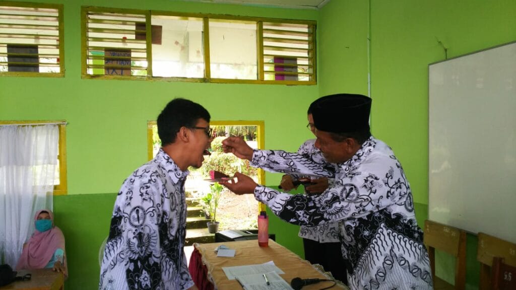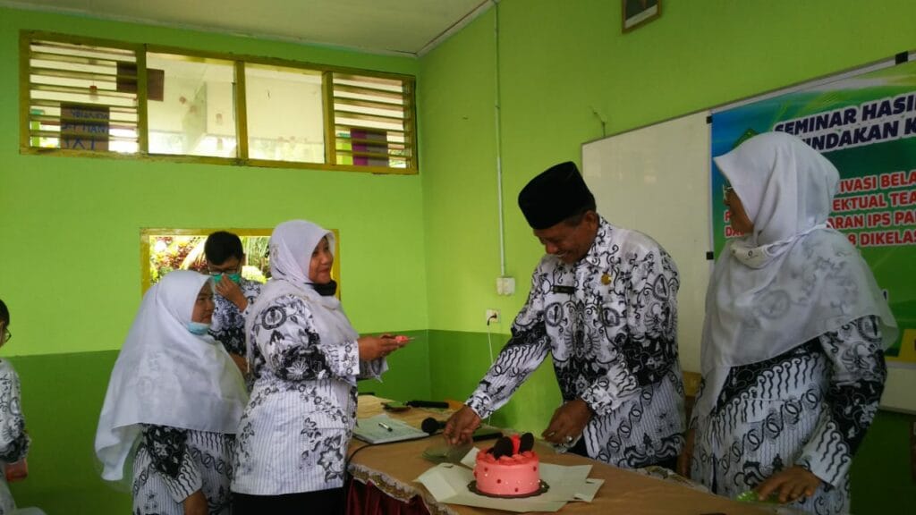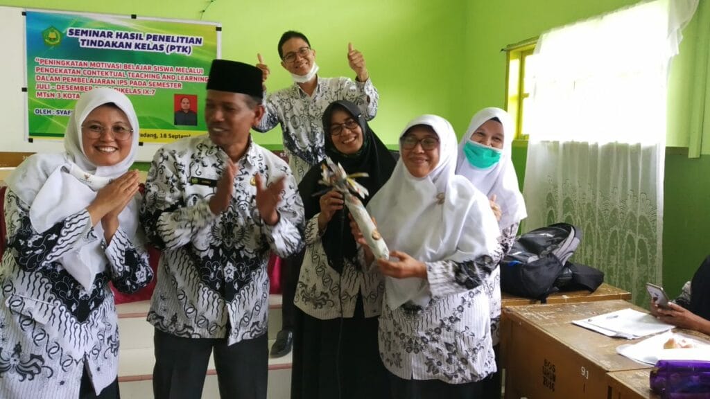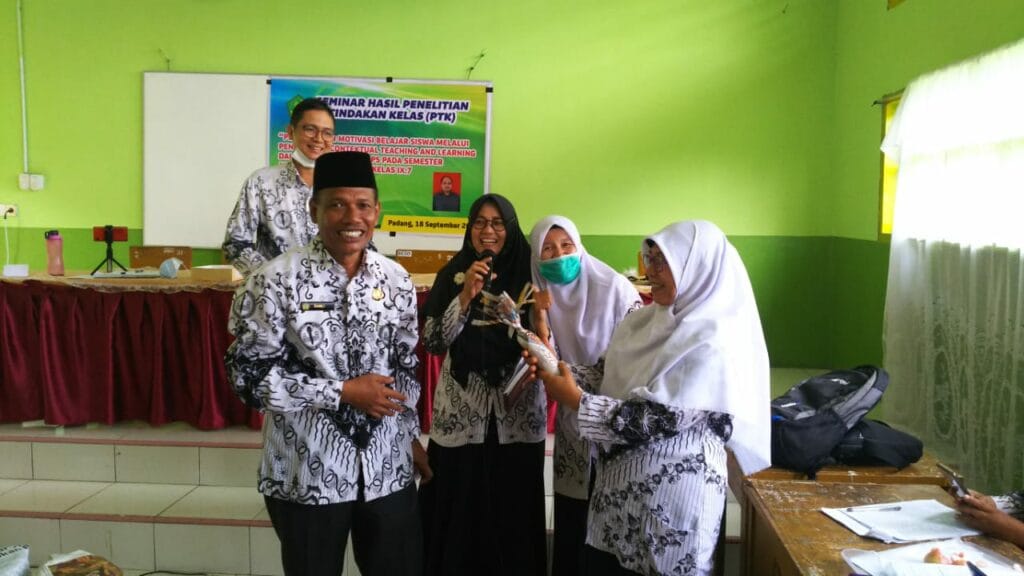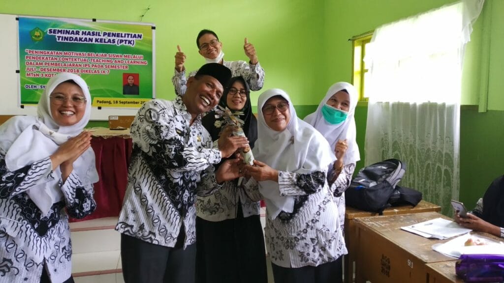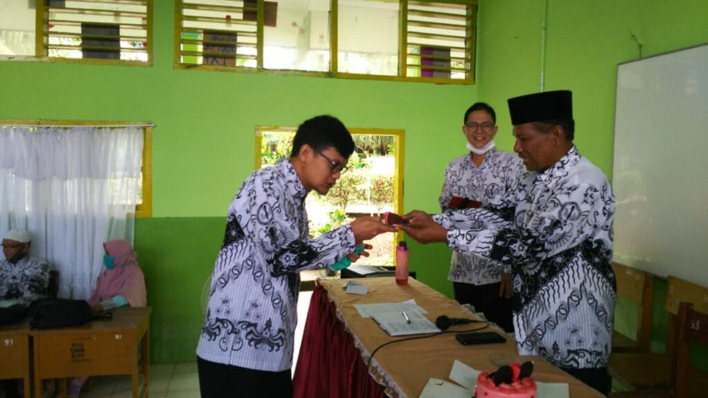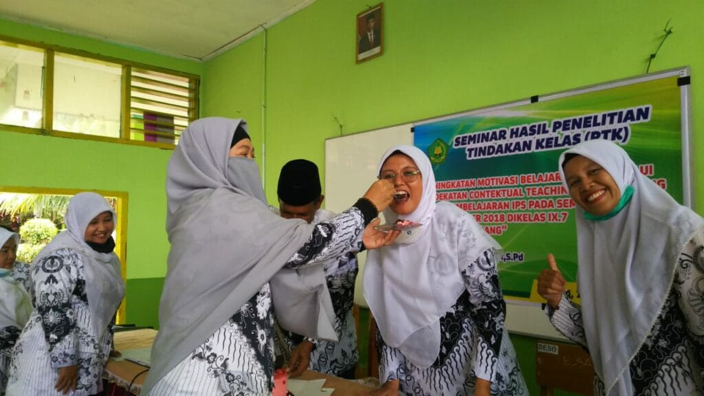 Padang – Kemeriahan HGN Tahun 2020 di MTsN 3 Kota Padang berlanjut dengan menyanyikan lagu hymne guru dan hymne madrasah oleh guru. Sebagai penutup rangkaian acara yakni dilakukan silaturrahmi antara guru ditandai dengan bertukar kado diantara para guru. (MN. Foto BS)