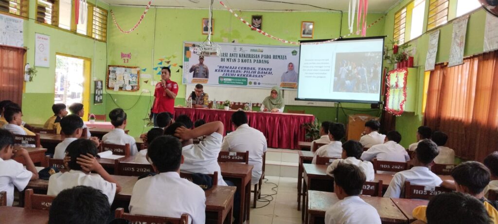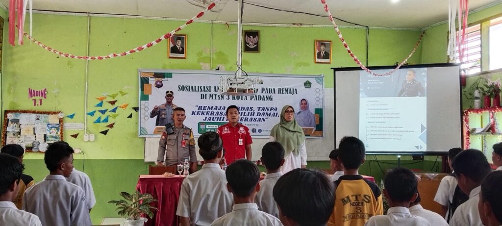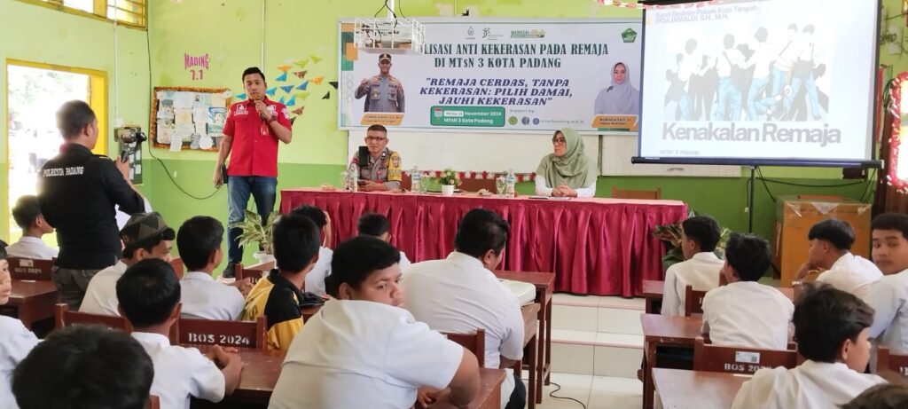 Padang, Humas – Kanitreskrim Polsek Koto Tangah, Ipda Jamaldi, MH, didampingi oleh Babinkantibmas Aiptu Jhoni Putra, SH, dan Humas Bripka Ragil Saputra, menggelar sosialisasi bertema Anti Kekerasan pada Remaja di MTsN 3 Kota Padang. Kegiatan yang berlangsung pada hari Selasa ini diikuti oleh perwakilan siswa dari kelas 7 hingga kelas 9, bertujuan untuk memberikan pemahaman kepada generasi muda tentang pentingnya menghindari tindakan kekerasan dan menciptakan lingkungan madrasah yang aman dan kondusif.