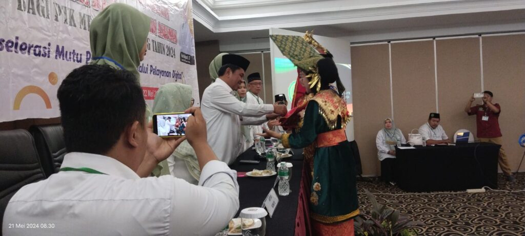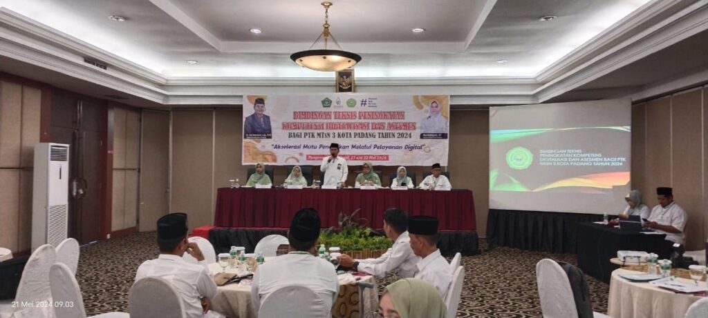 Padang, Humas – Kepala Kantor Kementerian Agama Kota Padang, H. Edy Oktafiandi, secara resmi membuka Bimbingan Teknis (Bimtek) MTsN 3 Kota Padang yang bertema “Akselerasi Mutu Pendidikan Melalui Pelayanan Digital” pada hari Selasa, 21 Mei 2024, di Pangeran Beach Hotel, Kota Padang. Pembukaan acara tersebut ditandai dengan prosesi “Cabiak Sirih” oleh H. Edy Oktafiandi, kepala madrasah Nurhidayati, dan pengawas managerial Nayusminar Nasrun beserta ketua panitia Melia S. Acara ini dihadiri oleh berbagai pihak yang berperan dalam dunia pendidikan madrasah, yang semuanya berkomitmen untuk meningkatkan mutu pendidikan melalui digitalisasi.