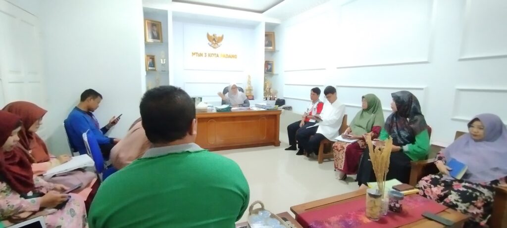 Padang, Humas – Kepala Madrasah Tsanawiyah Negeri 3 Kota Padang melaksanakan evaluasi bersama dengan para guru dalam upaya meningkatkan pelayanan program kelas digital di semester genap mendatang (15/12).