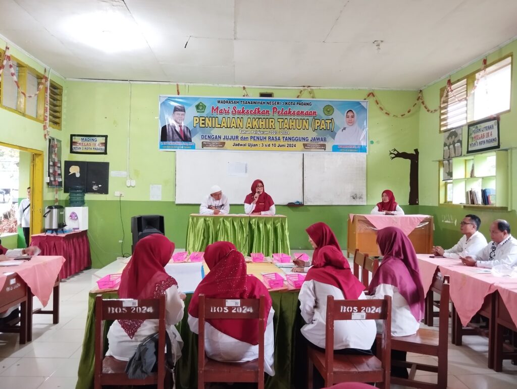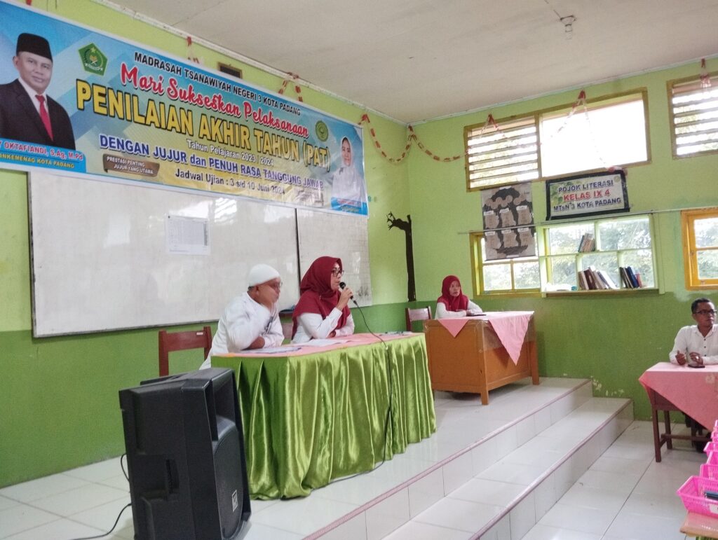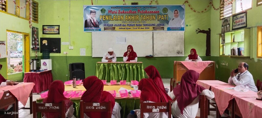 Padang, Humas – Untuk memastikan kelancaran dan keberhasilan penilaian akhir tahun semester genap, Kepala Madrasah Tsanawiyah Negeri 3 Kota Padang mengadakan briefing bersama pengawas ujian pada hari Senin (03/06). Briefing ini adalah langkah penting untuk menyatukan visi dan memastikan semua pihak yang terlibat dalam penilaian akhir tahun memiliki pemahaman yang sama tentang prosedur dan standar evaluasi. Dalam pertemuan ini, Kepala Madrasah, Nurhidayati, menekankan pentingnya pengawas ujian memahami tugas dan tanggung jawab mereka serta pentingnya persiapan yang matang untuk menjaga integritas dan keadilan ujian.