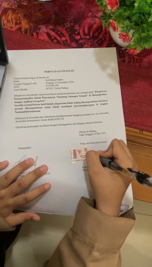 Tim ketiga terdiri dari Sufi Sabita Hanan Tari dan Nasywa Dwi Irawan yang mengangkat tema kesehatan mental dengan judul “Aku Tak Mau Dipasung: Peran Panti Rehabilitasi Yayasan Pelita Jaya Insani dalam Pengobatan ODGJ di Sumatera Barat”. Sementara itu, Kalifahtur Rahmi tampil sebagai peserta tunggal dengan penelitian berjudul “Eksplorasi Etnomatika dalam Penyusunan Suntiang Satangah Tusuak di Minangkabau dengan Aplikasi Geogebra”, yang menggabungkan kearifan lokal dengan pendekatan matematika modern. Keempat proposal ini mencerminkan keberagaman tema dan kedalaman analisis yang menunjukkan bahwa siswa madrasah juga mampu bersaing dalam dunia riset yang inovatif dan relevan. (AA. Foto: AA)