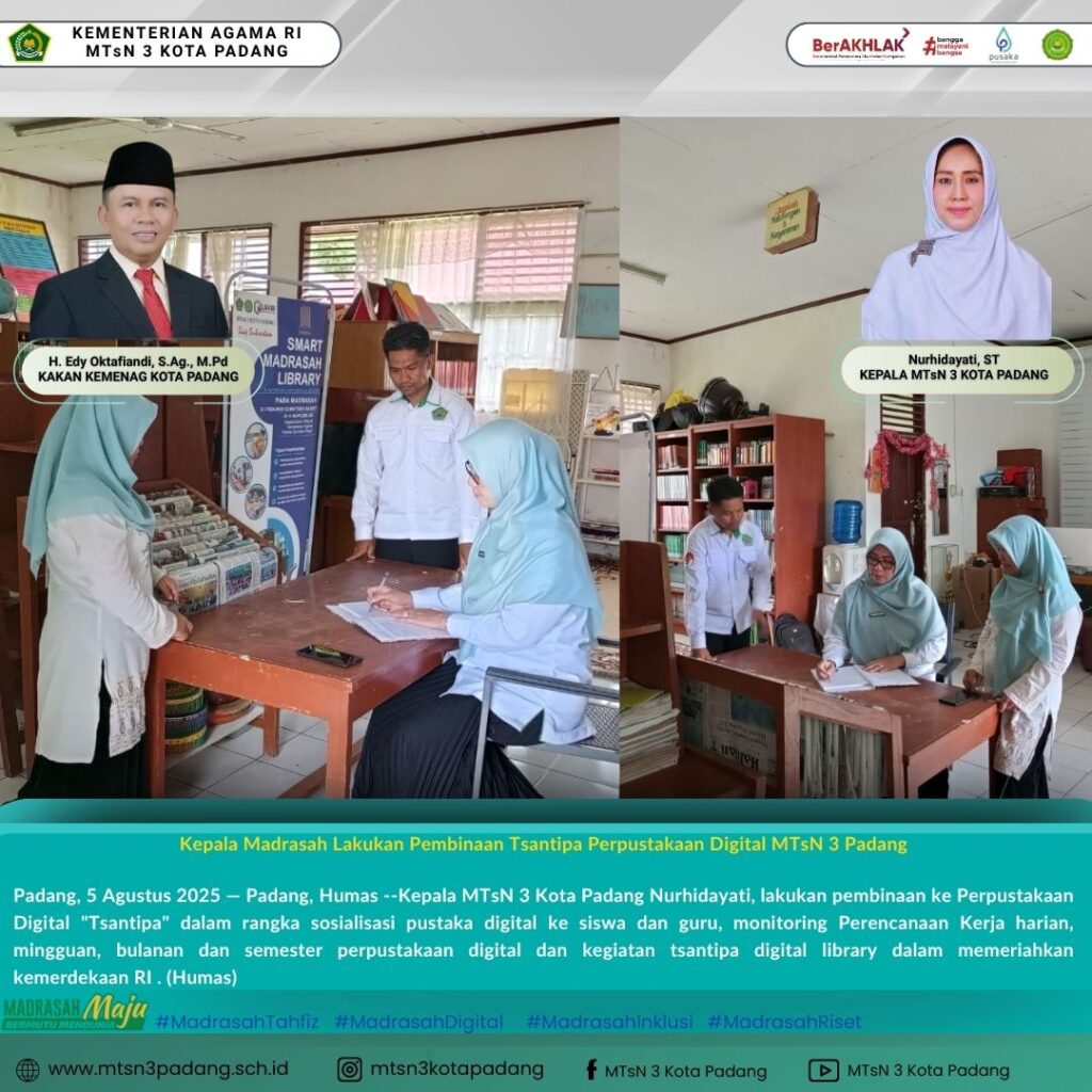 Padang, Humas – Selasa, 5 Agustus 2025, Kepala MTsN 3 Kota Padang, Nurhidayati, ST, melaksanakan pembinaan intensif terhadap pengelolaan Perpustakaan Digital “Tsantipa” sebagai bagian dari upaya transformasi literasi digital di madrasah. Kegiatan ini berlangsung di ruang perpustakaan madrasah dengan melibatkan pustakawan, staf perpustakaan, serta guru pendamping. Fokus utama pembinaan adalah penguatan sistem manajemen pustaka digital serta persiapan kegiatan literasi berbasis teknologi untuk siswa dan guru.