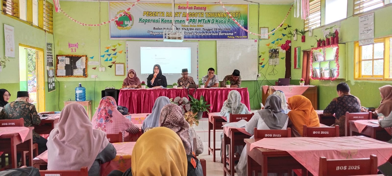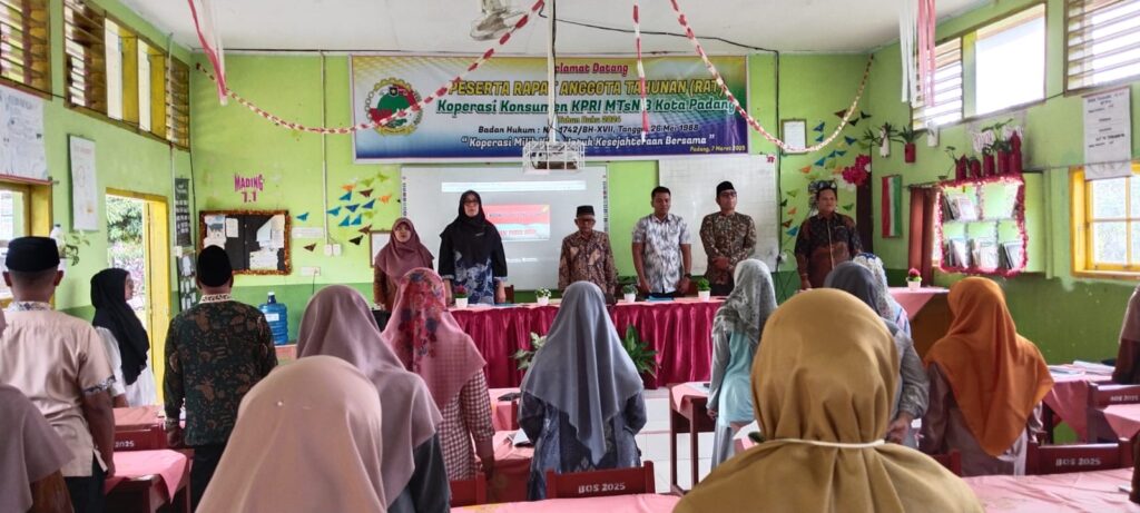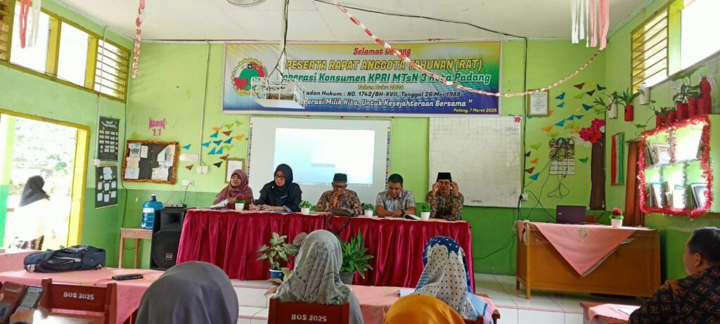 Padang, Humas – Kepala MTsN 3 Kota Padang, Nurhidayati, secara resmi membuka Rapat Anggota Tahunan (RAT) Koperasi Konsumen KPRI MTsN 3 Kota Padang Tahun Buku 2024 pada Jumat, 7 Maret 2025. Acara yang berlangsung di Ruang Pertemuan MTsN 3 Kota Padang ini turut dihadiri oleh perwakilan KPRI Sumatera Barat, Fauzan Yazid, serta perwakilan dari Dinas Koperasi dan UKM Kota Padang, Ade Kristian dan Heri Luka Nugraha. Kehadiran para tamu undangan ini menjadi bentuk dukungan bagi pengelolaan koperasi yang lebih baik di lingkungan madrasah.