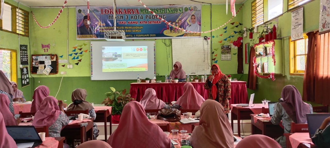 Padang, Humas – Sabtu, 1 Februari 2025, MTsN 3 Kota Padang menggelar Lokakarya Madrasah Inklusi dengan menghadirkan Kepala UPTD Unit Layanan Disabilitas Kota Padang, Yoszya Silawati, S.Pd, M.Si, sebagai narasumber utama. Kegiatan yang berlangsung pada Sabtu pagi pukul 08.30 WIB ini bertujuan untuk meningkatkan pemahaman guru dan tenaga kependidikan dalam menciptakan iklim madrasah yang lebih inklusif bagi peserta didik berkebutuhan khusus. Dalam lokakarya ini, Yoszya menyampaikan materi bertajuk “Peran Unit Layanan Disabilitas dalam Membangun Iklim yang Inklusif di Madrasah.”