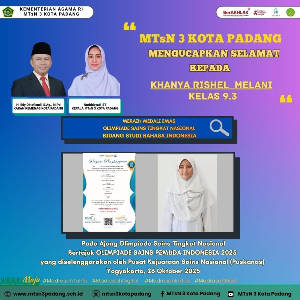 Padang, Humas – Prestasi membanggakan kembali ditorehkan oleh siswa-siswi terbaik MTsN 3 Kota Padang. Khanya Rishel Melani, siswa kelas 9.3, sukses meraih medali emas dalam bidang studi Bahasa Indonesia pada ajang Olimpiade Sains Pemuda Indonesia (OSPI) 2025. Kompetisi bergengsi ini diselenggarakan oleh Pusat Kejuaraan Sains Nasional (Puskanas) dan berlangsung di Yogyakarta pada 26 Oktober 2025.