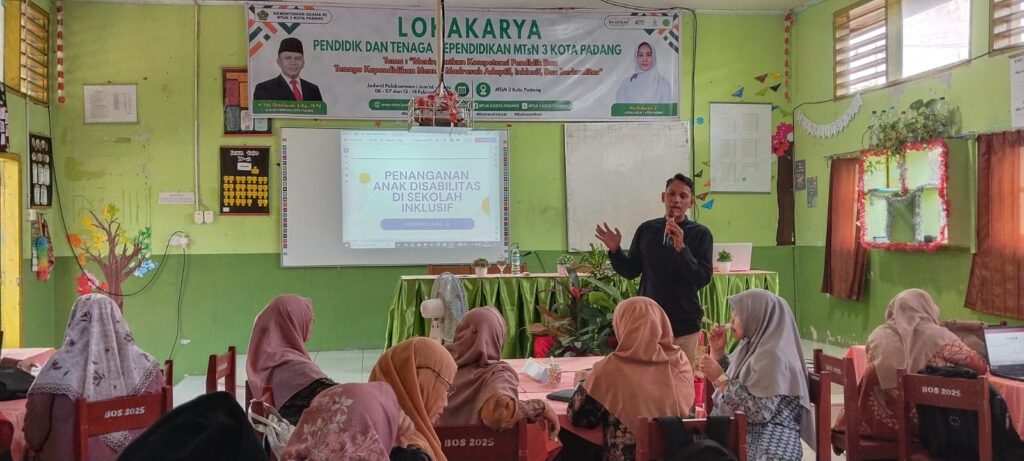 Padang, Humas – Lokakarya hari ke-2 yang diselenggarakan di MTsN 3 Kota Padang pada Sabtu, 7 Februari 2026, berlangsung dengan penuh antusias dan semangat kolaboratif. Kegiatan ini menghadirkan materi bertajuk “Penanganan Anak Disabilitas di Sekolah Inklusif” yang disampaikan oleh Bapak Nofriadi, S.Pd, Gr. dari UPTD Layanan Disabilitas dan Pendidikan Inklusif (LDPI) Kota Padang. Dalam pemaparannya, narasumber menekankan pentingnya pemahaman karakteristik peserta didik disabilitas serta strategi pendampingan yang tepat di lingkungan madrasah inklusif.