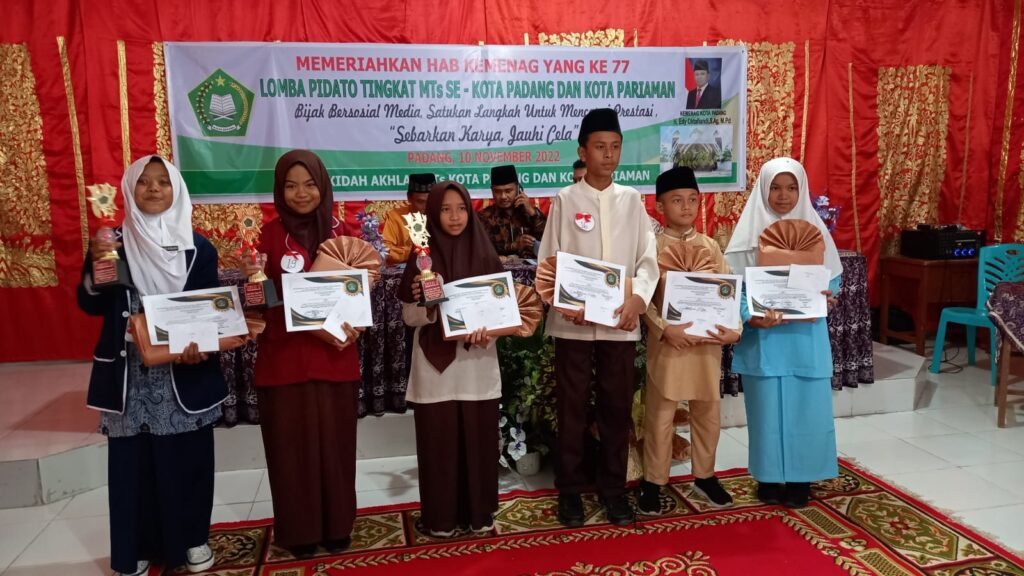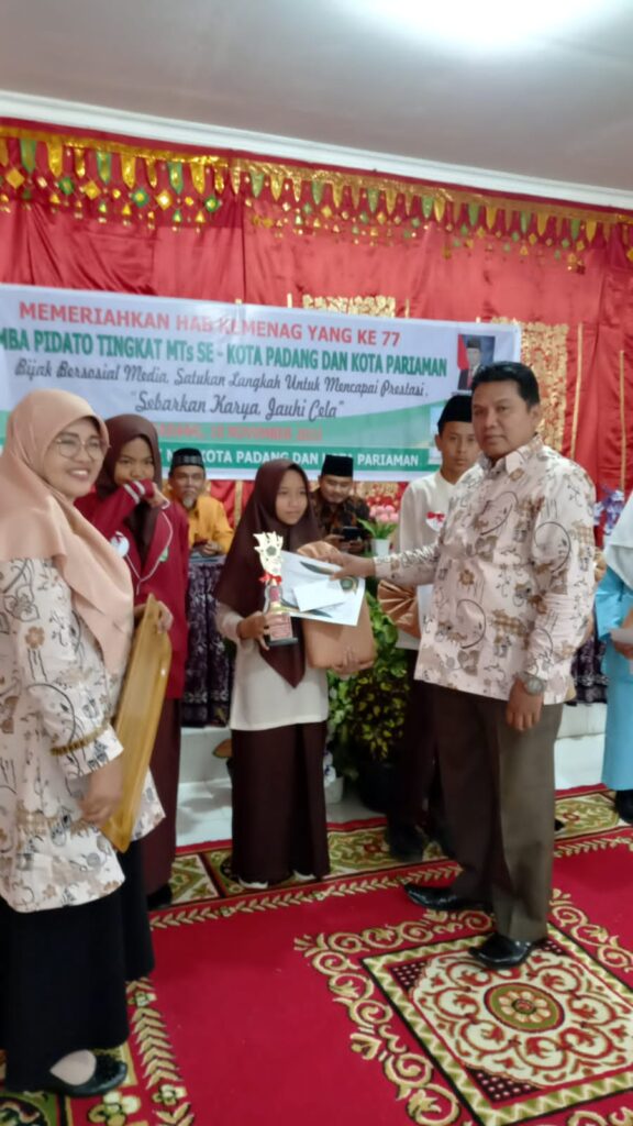 Padang, Humas – Lomba pidato yang diikuti siswa MTs se-Kota Padang dan Kota Pariaman yang diselenggarakan oleh MGMP Akidah Akhlak dalam rangka HAB Kementerian Agama yang ke-77, siswa MTsN 3 Kota Padang atas nama Syahratul Kamaliah Putri raih juara tiga pada pengumuman yang disampaikan panitia, Kamis (10/11) bertempat di MTsN 5 Kota Padang.