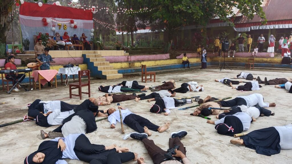 Dalam drama yang digelar di lapangan madrasah ini, siswa-siswa menampilkan adegan-adegan penting dari masa revolusi, mulai dari Proklamasi Kemerdekaan hingga perjuangan rakyat melawan penjajah. Para pelaku drama dengan penuh semangat menghidupkan kembali momen-momen bersejarah dan menghadirkan suasana masa lampau yang mengharukan.