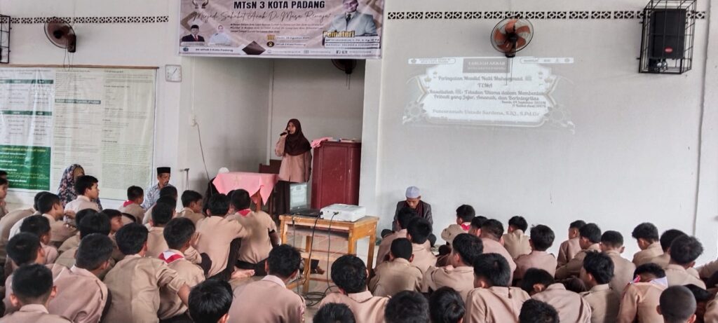 Dalam sambutannya, Kepala Madrasah Nurhidayati, menyampaikan bahwa pembinaan di bidang keagamaan terus dilakukan secara berkesinambungan di MTsN 3 Kota Padang. Salah satu bentuknya adalah melalui kegiatan tausiah yang mengangkat perjalanan hidup Rasulullah SAW. Beliau mengajak seluruh peserta untuk menjadikan momen Maulid Nabi ini sebagai kesempatan memperkuat cinta kepada Rasulullah dan mencontoh perilaku beliau dalam kehidupan sehari-hari.