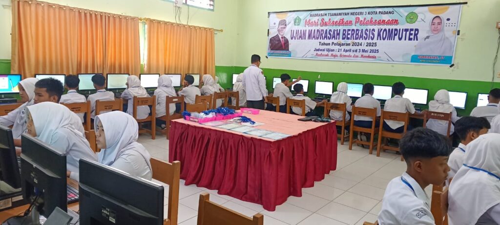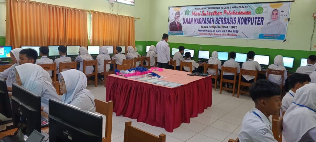 Padang, Humas – MTsN 3 Kota Padang resmi melaksanakan Ujian Madrasah Berbasis Komputer (UMBK) bagi peserta didik kelas IX tahun ajaran 2024/2025. Kegiatan ini dimulai pada Senin, 21 April 2025 dan akan berlangsung hingga Sabtu, 3 Mei 2025. UMBK merupakan salah satu bentuk evaluasi akhir yang bertujuan untuk mengukur pencapaian kompetensi peserta didik selama mengikuti proses pembelajaran di tingkat MTs. Ujian ini dilaksanakan secara daring menggunakan perangkat komputer yang telah disiapkan oleh madrasah, dengan pengawasan ketat dari panitia dan guru pengawas demi menjaga kelancaran dan kejujuran pelaksanaan ujian.
