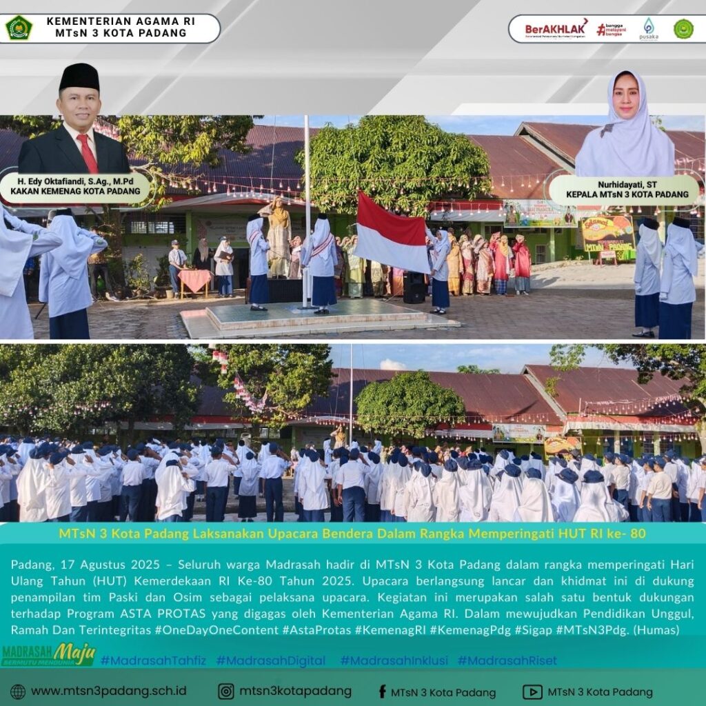 Padang, Humas – Minggu, 17 Agustus 2025, seluruh warga MTsN 3 Kota Padang melaksanakan Upacara Bendera dalam rangka memperingati Hari Ulang Tahun (HUT) Kemerdekaan Republik Indonesia ke-80. Bertempat di lapangan madrasah, upacara berlangsung dengan khidmat, tertib, dan penuh semangat kebangsaan. Peserta upacara terdiri dari siswa, guru, dan tenaga kependidikan yang hadir mengenakan pakaian seragam lengkap sebagai wujud penghormatan pada peringatan hari bersejarah bangsa ini.