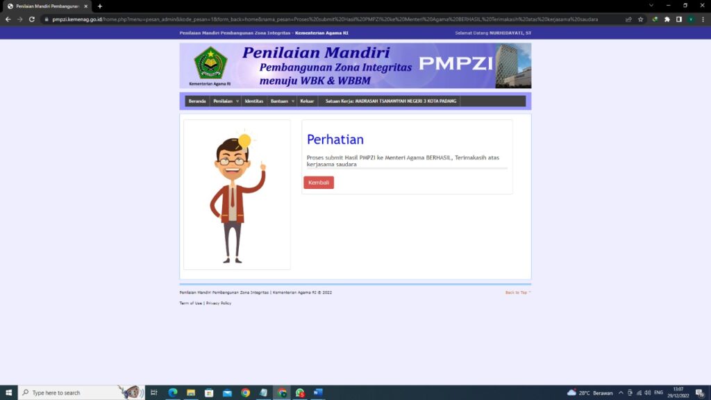 Padang, Humas – MTsN 3 Kota Padang lolos pada tahap verifikasi awal pembangunan Zona Integritas menuju Wilayah Bebas Korupsi (WBK) dan Wilayah Birokrasi Bersih dan Melayani (WBBM) tahun 2022.