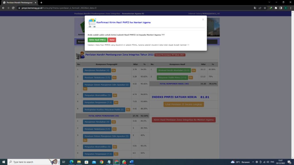 Dari 1.053 satuan kerja (satker) yang menjadi calon pilot project tahun 2022, hanya 314 satker atau 26,45% yang memenuhi syarat pada tahapan penilaian lebih lanjut oleh tim penilai kemenag Republik Indonesia.