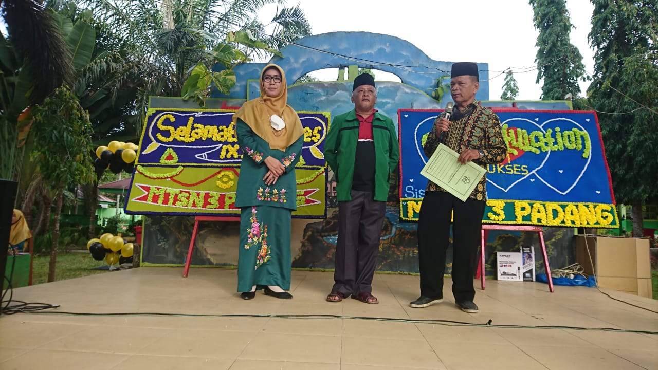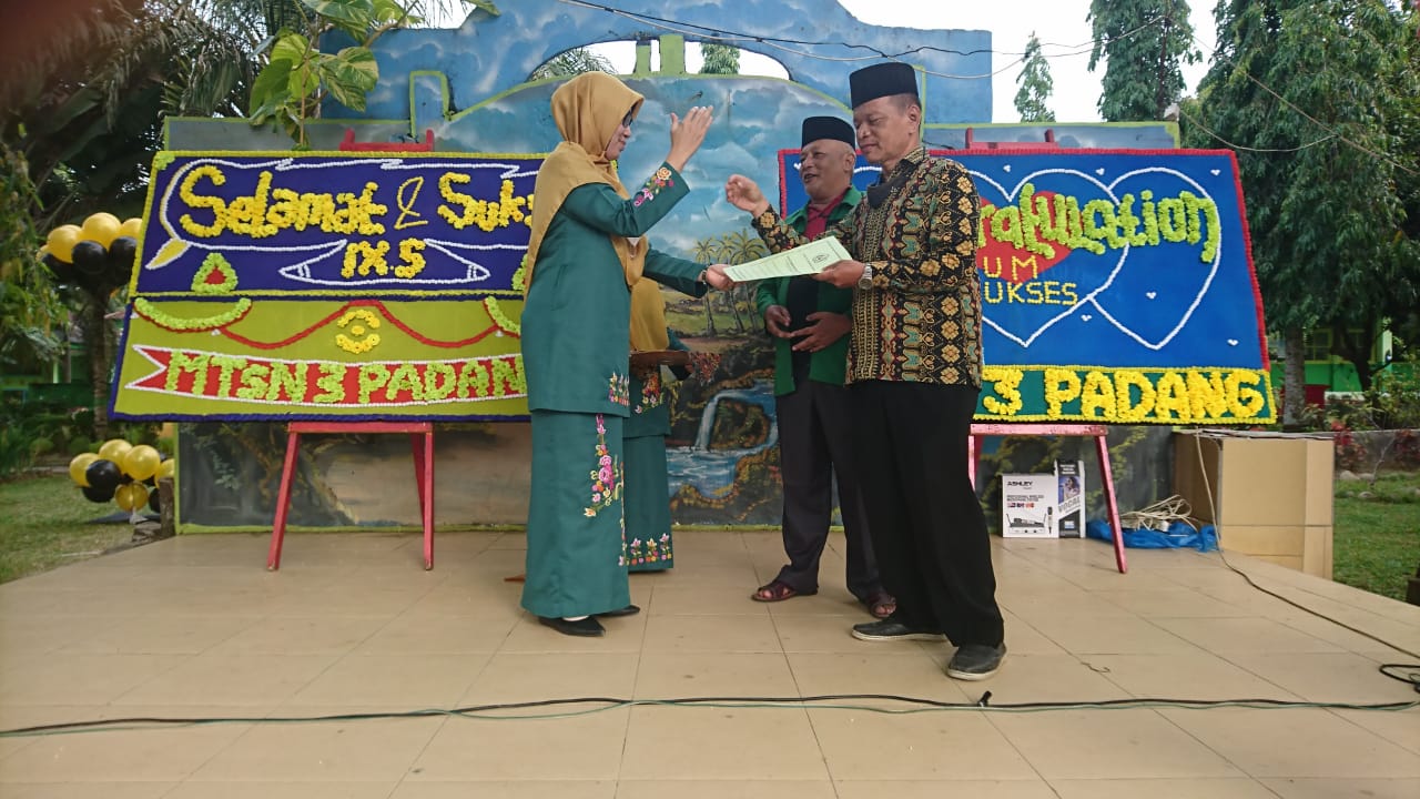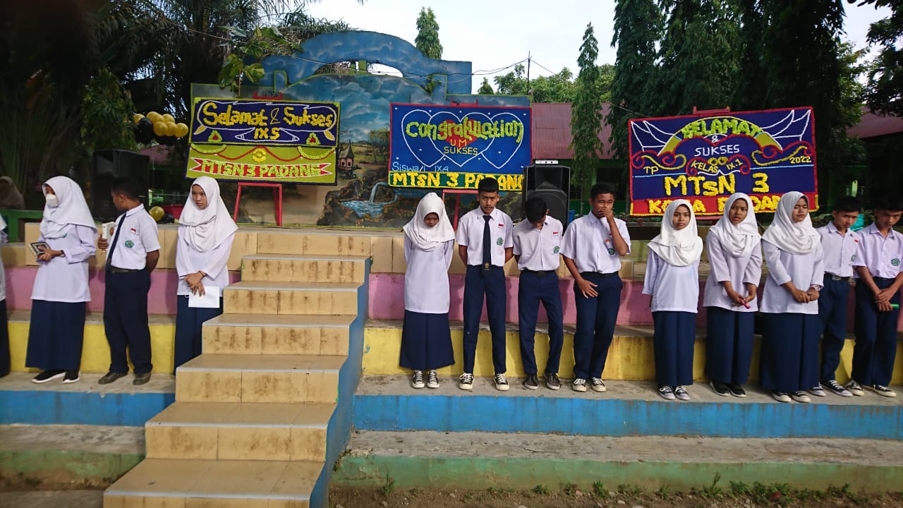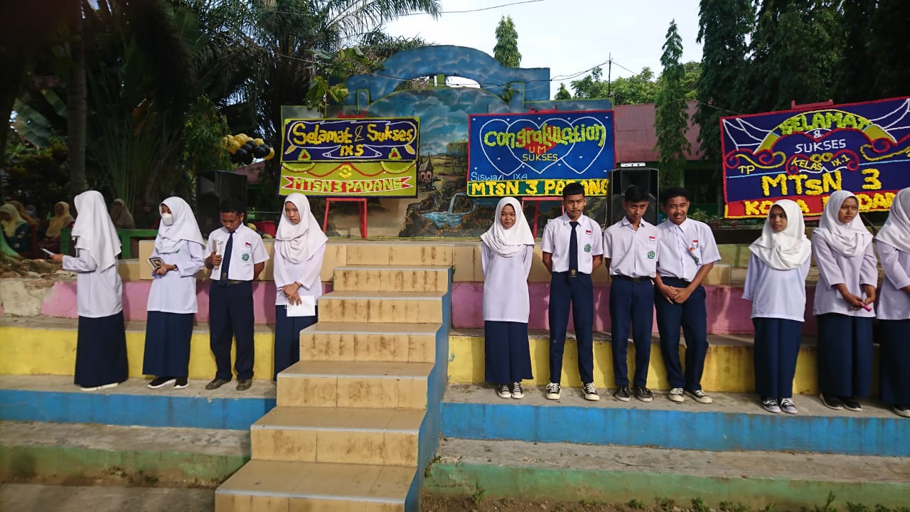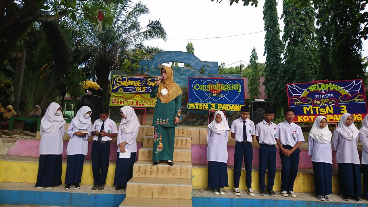 Padang, Humas – Pelepasan peserta didik kelas IX MTsN 3 Kota Padang sebanyak 206 orang berlangsung pada hari Kamis, tanggal 31 Maret 2021 pukul 07.00 WIB di lapangan MTsN 3 Kota Padang oleh Nurhidayati, S.T selaku kepala Madrasah kepada perwakilan orang tua yang diterima oleh ketua Komite Bapak Esrizal, S.Pd dan Bapak Tengku Jamaris. Kegiatan dihadiri oleh seluruh peserta didik kelas IX, pengurus OSIM dan seluruh Dewan Guru di saksikan juga oleh siswa Kelas VII dan siswa Kelas VIII.