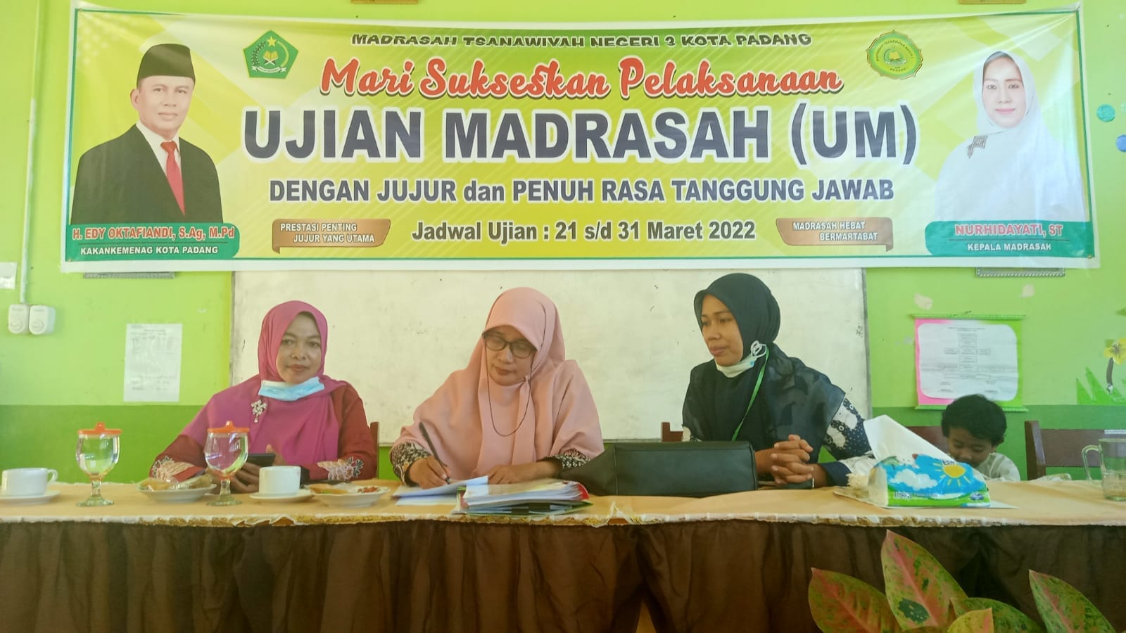 Pengawas Manajerial Ilda Peliana, S.Pd tiba di MTsN 3 Kota Padang pukul 19.00 WIB, dan disambut oleh kepala madrasah Nurhidayati, S.T dan semua unsur pimpinan yang juga panitia UM di ruang Panitia Ujian Madrasah.
