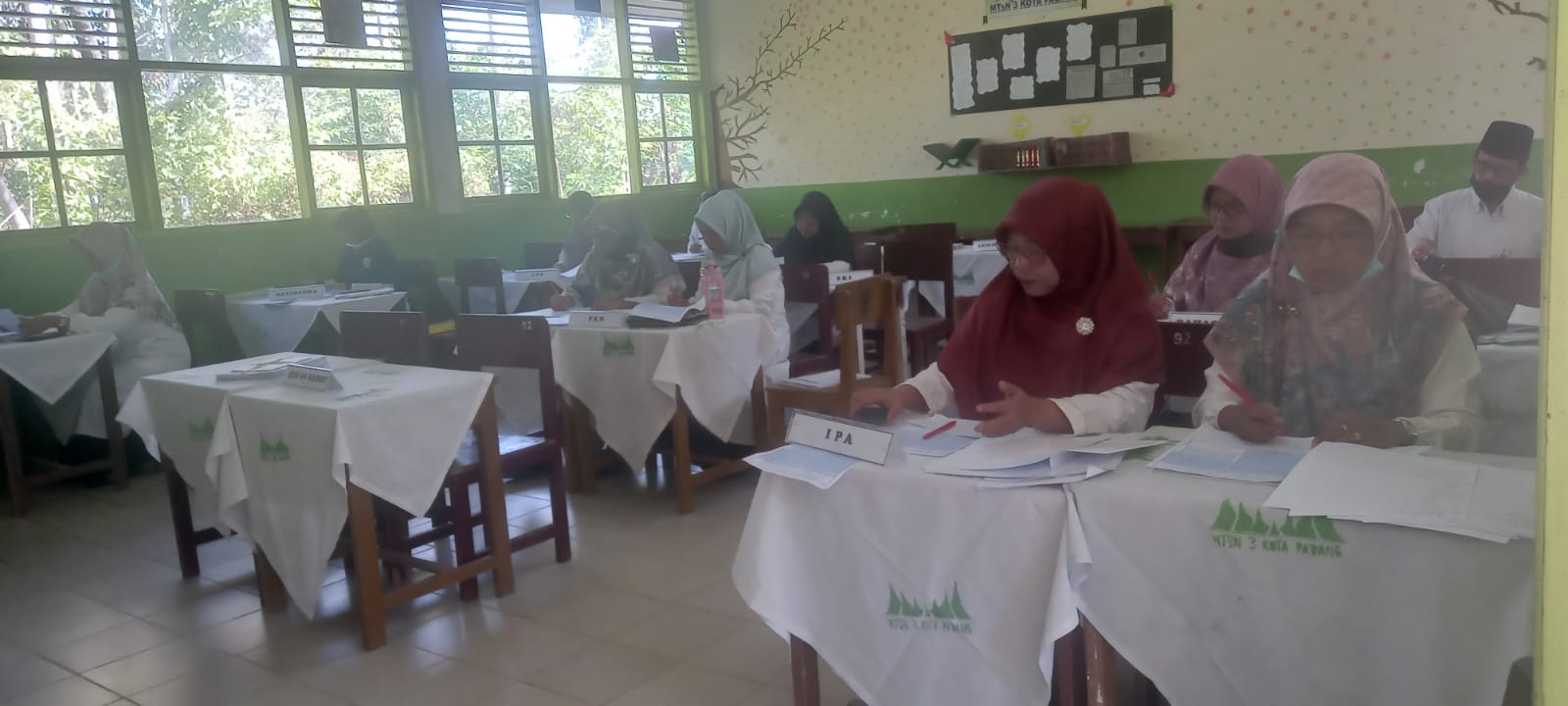 Padang, Humas – MTsN 3 Kota Padang laksanakan pemeriksaan hasil Ujian Madrasah (UM) Tahun Pelajaran 2021/2022 pada hari Senin, tanggal 28 Maret 2021 pada pukul 07.00 WIB di ruangan pertemuan MTsN 3 Kota Padang oleh guru mapel UM kelas IX MTsN 3 Kota Padang.