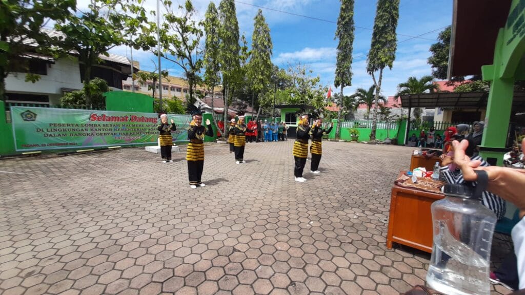 Padang, Humas – Lomba Senam Maumere atau Gemu Famire dalam rangka memperingati Hari Amal Bakti (HAB) ke-76 berlangsung meriah di halaman kantor Kemenag Kota Padang, Kamis (23/12). Tim senam yang rutin berlatih sejak beberapa waktu terakhir tampil memukau. Tim penilai pun terpesona melihat kelincahan dan kekompakan tim senam.