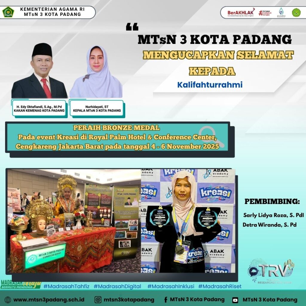 Padang, Humas – MTsN 3 Kota Padang kembali menorehkan prestasi membanggakan di ajang Kompetisi Riset dan Inovasi Siswa Indonesia (Kreasi) 2025 yang digelar di Royal Palm Hotel & Conference Center, Cengkareng, Jakarta Barat, pada 4–6 November 2025. Dalam kompetisi bergengsi tingkat nasional tersebut, madrasah ini berhasil meraih sejumlah penghargaan di bidang MSTL (Matematika, Sains, Teknologi, dan Lingkungan). Salah satu siswi terbaik, Kalifahtur Rahmi, berhasil mempersembahkan medali perunggu (Juara 3) pada sub bidang Matematika, Fisika Terapan, dan Teknologi Rekayasa.