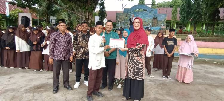 Padang, Humas – Kepala MTsN 3 Kota Padang Nurhidayati memberikan secara seremonial piala Juara II LTUB (Lomba Tata Upacara Bendera) se-Sumatera Barat yang berhasil disabet tim Paskibra MTsN 3 Kota Padang dihadapan ratusan siswa, guru, pegawai dan warga madrasah selesai acara muhadharah, Jumat pagi (03/03).