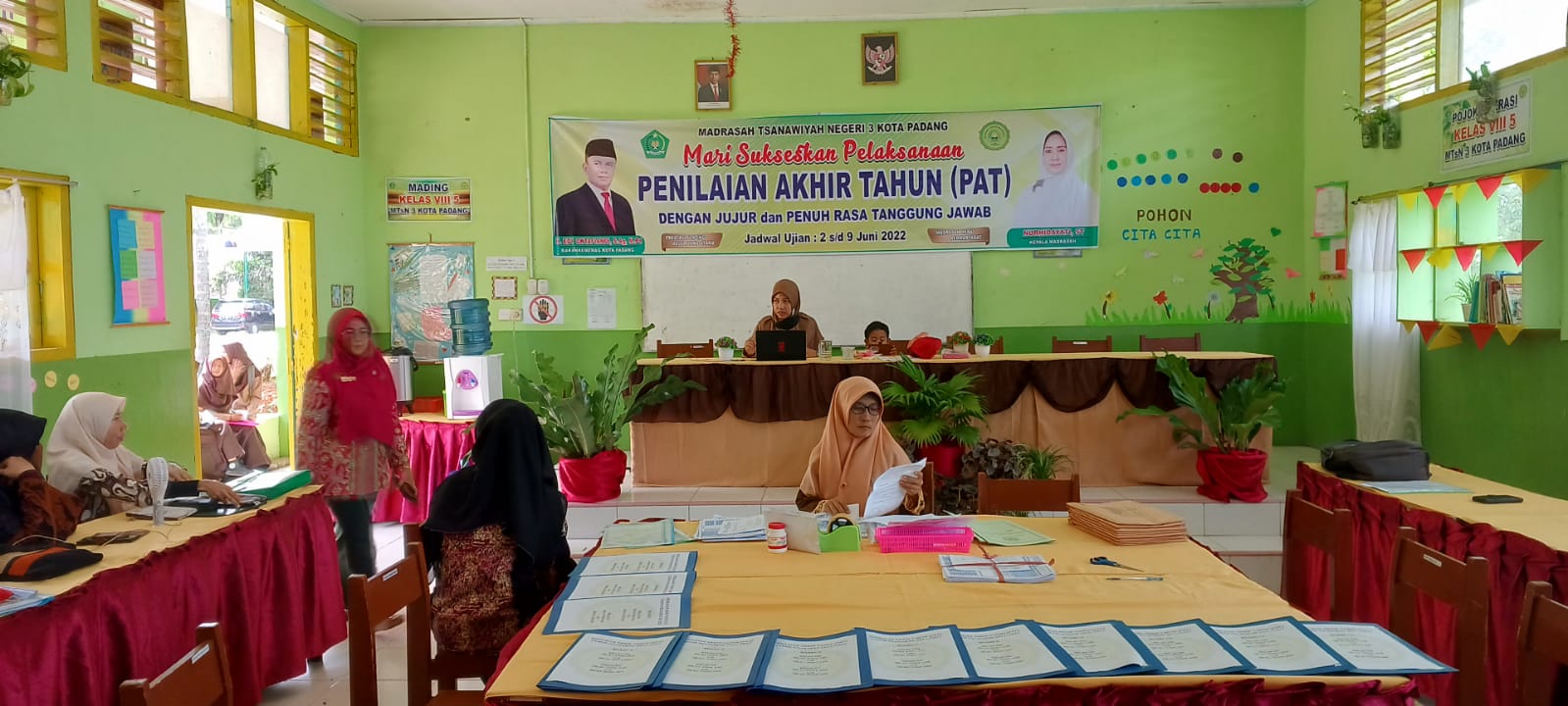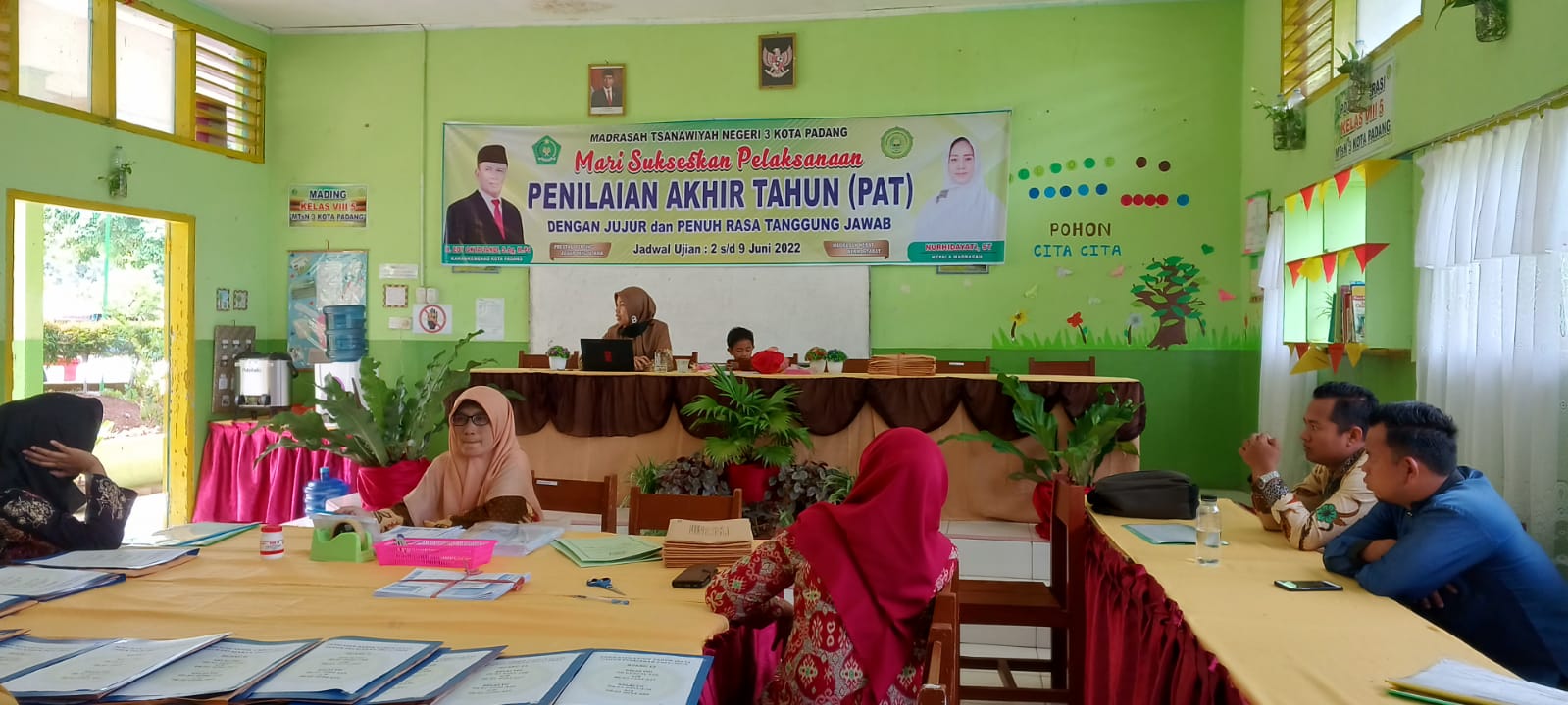 Padang, Humas – Rabu (02-06-2022) hari pertama pelaksanaan PAT Semester Genap TP 2021/2022 dibuka langsung oleh Kepala MTsN 3 Kota Padang yang diwakili oleh Waka Kurikulum Melia dan dihadiri panitia, pengawas ruang, guru dan tenaga pendidikan. PAT Semester Genap akan berlangsung selama 7 hari mulai 02 Juni 2022 hingga 09 Juni 2022 diikuti 489 siswa kelas VII dan VIII.