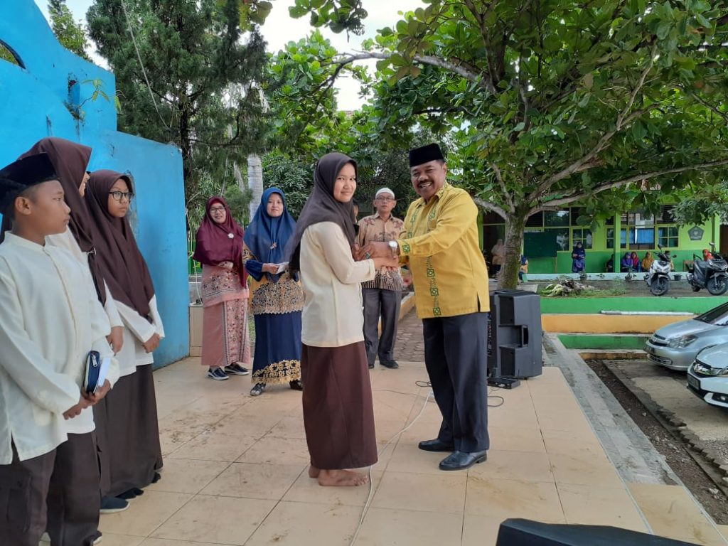 Padang - Kepala MTsN 3 Kota Padang Afrizal Can, S.Ag memberikan hadiah kepada siswa-siswi yang hafal Al-Qur'an. Pemberian reward ini dalam rangka memotivasi siswa dalam menghafal Al-Qur'an. Pemberian reward ini dilaksanakan sehabis kegiatan muhadharah yang rutin diadakan setiap hari jumat. Kepala madrasah menyampaikan dengan pemberian reward akan muncul penghafal-penghafal Al-Qur'an yang akan meramaikan wisuda tahfiz kedua, nantinya yang digelar Kemenag Kota Padang. (SS. Foto : SS)