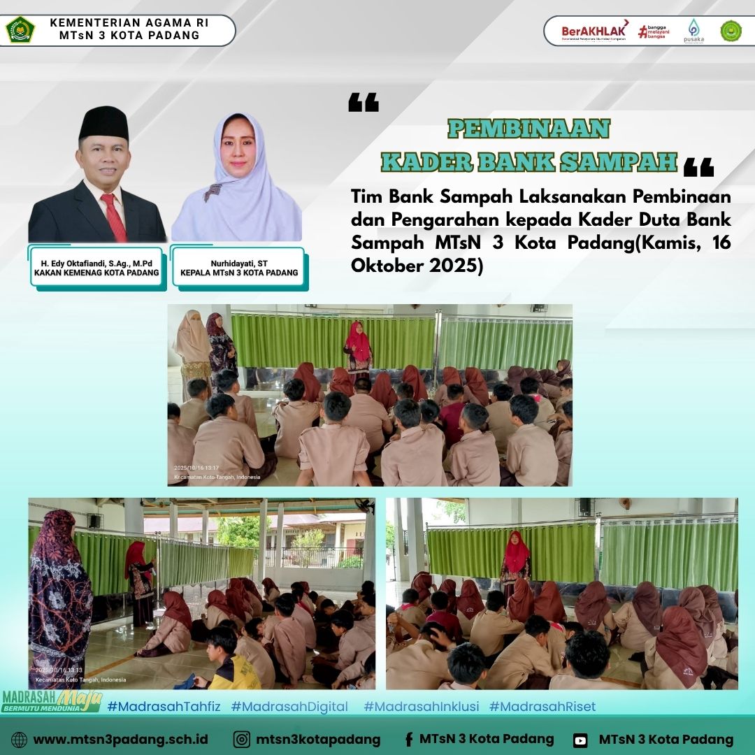 Padang, Humas – Sebagai bagian dari komitmen dalam menciptakan madrasah yang ramah lingkungan, MTsN 3 Kota Padang melaksanakan pembinaan khusus bagi para Kader Bank Sampah pada Kamis, 16 Oktober 2025. Kegiatan ini dihadiri oleh para siswa yang tergabung sebagai Kader Duta Bank Sampah dengan didampingi langsung oleh jajaran guru serta Kepala MTsN 3 Kota Padang. Dalam pembinaan ini, para siswa mendapatkan arahan mengenai pentingnya pengelolaan sampah yang tepat demi menjaga kebersihan dan kelestarian lingkungan madrasah secara berkelanjutan.