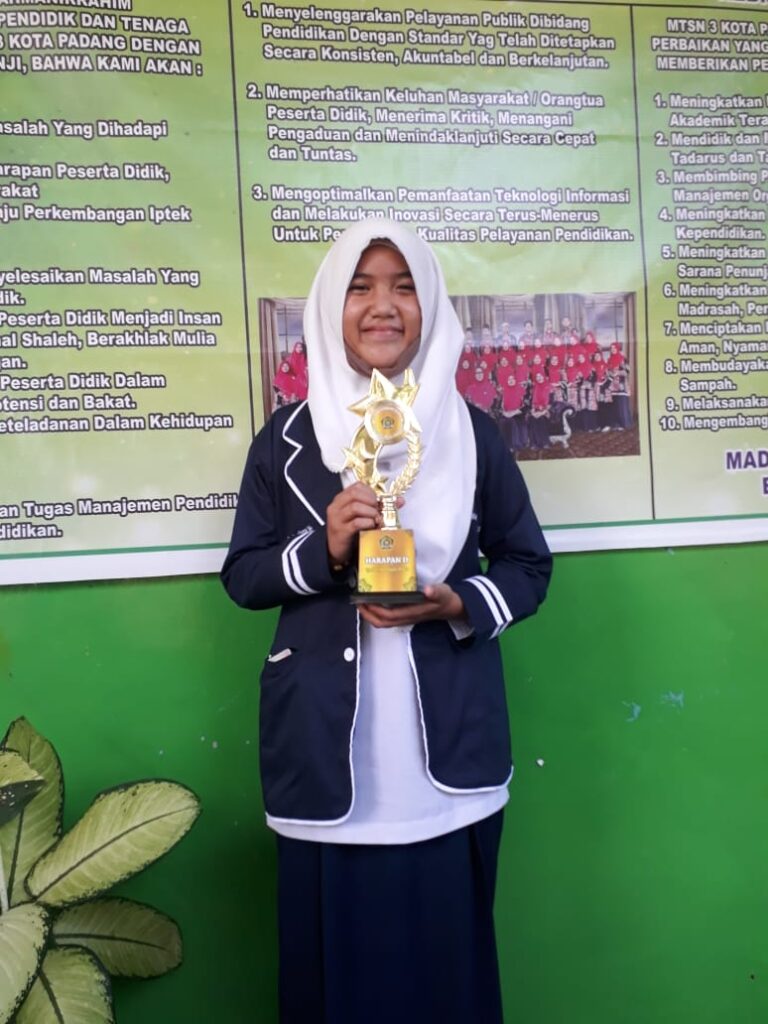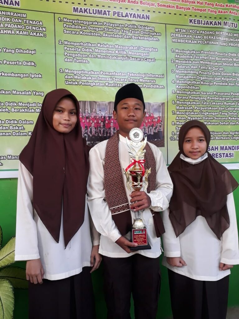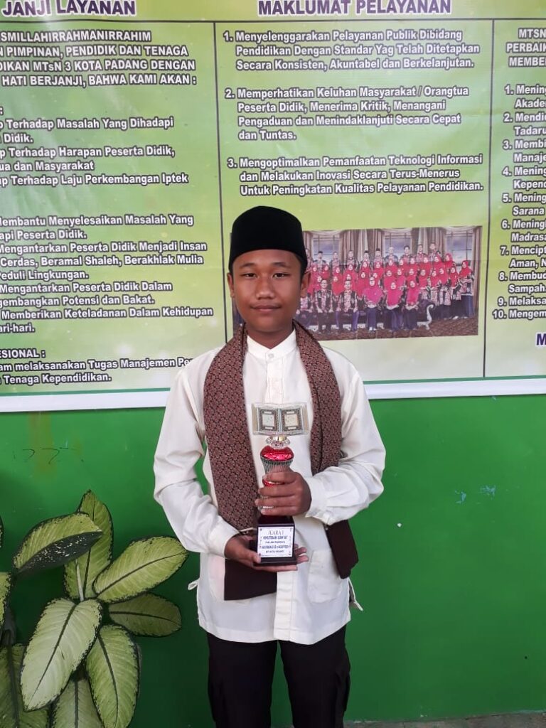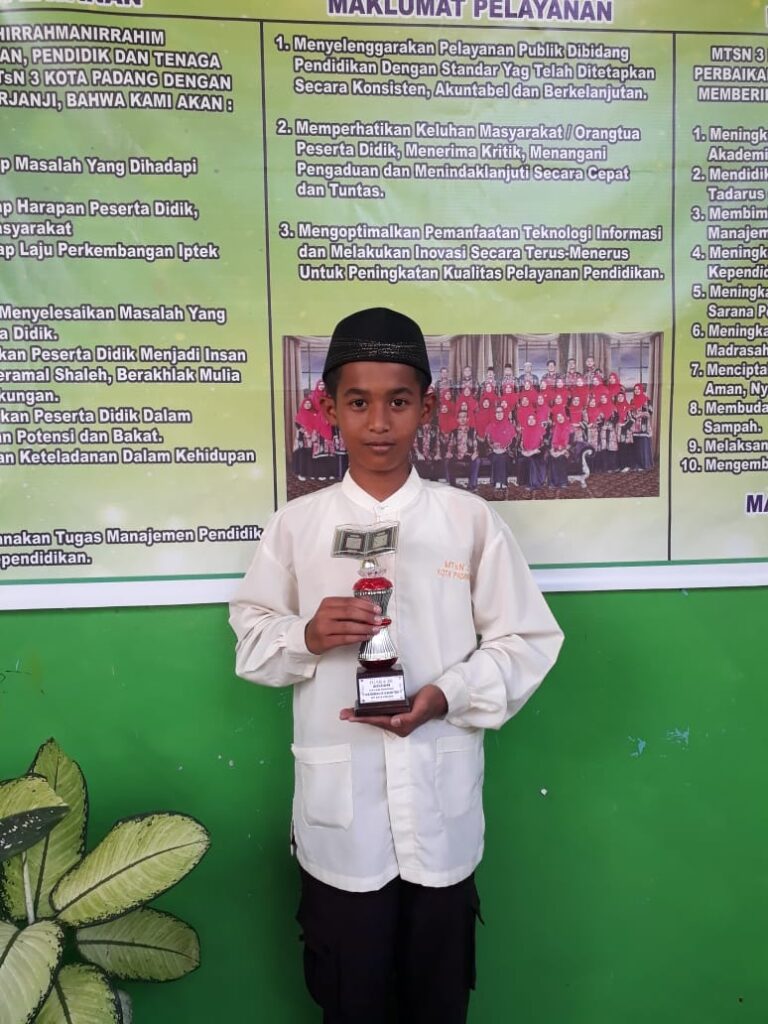 - Muhammad Wahyu Darmawan kelas 9-4 yang meraih Juara 3 pada lomba Adzan yang dibina oleh Amri, S.Pd.I dan Fitri Suryani, S.Pd.I