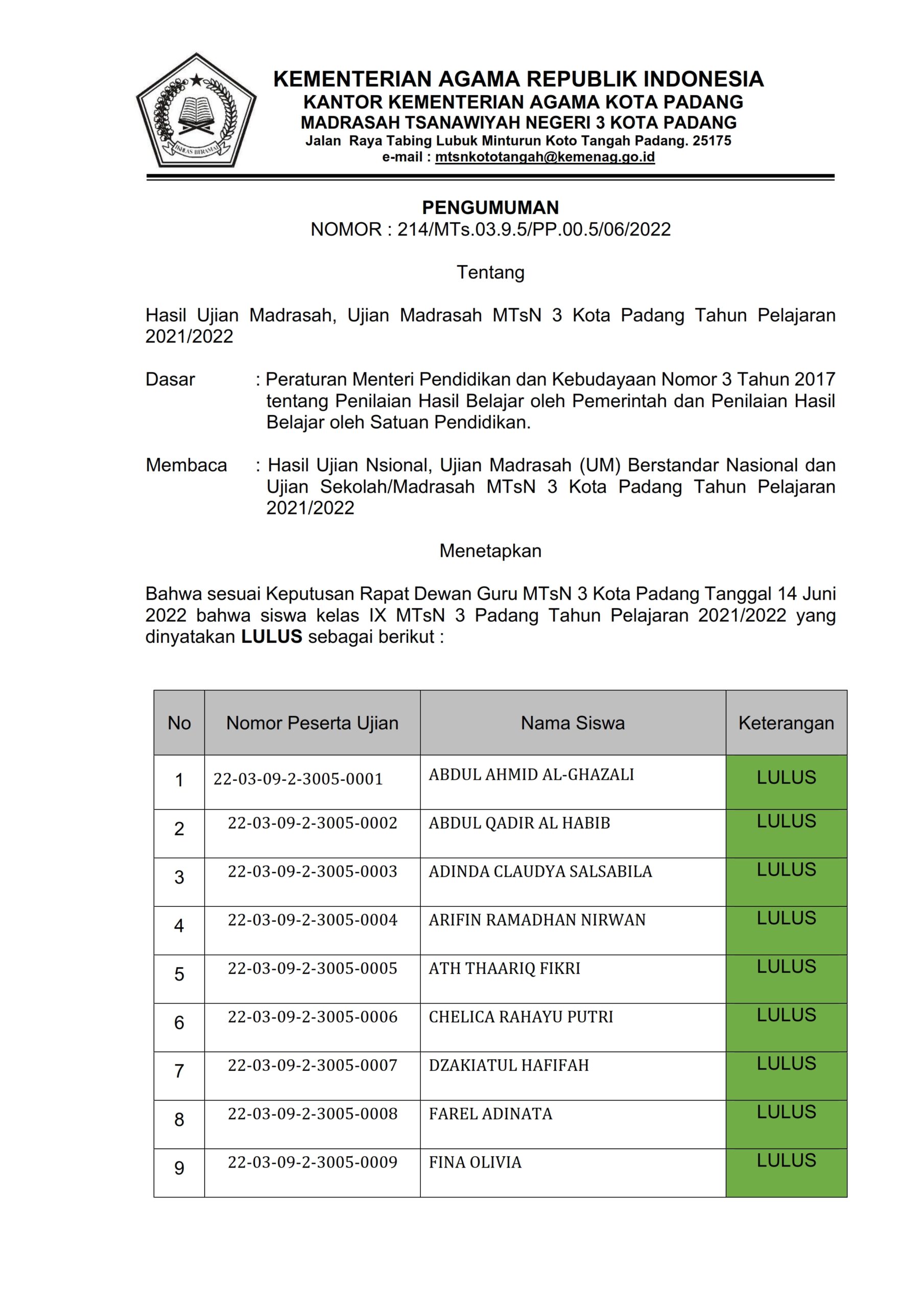 Silahkan klik tautan berikut untuk melihat hasil kelulusan -> https://lulus.mtsn3padang.sch.id/