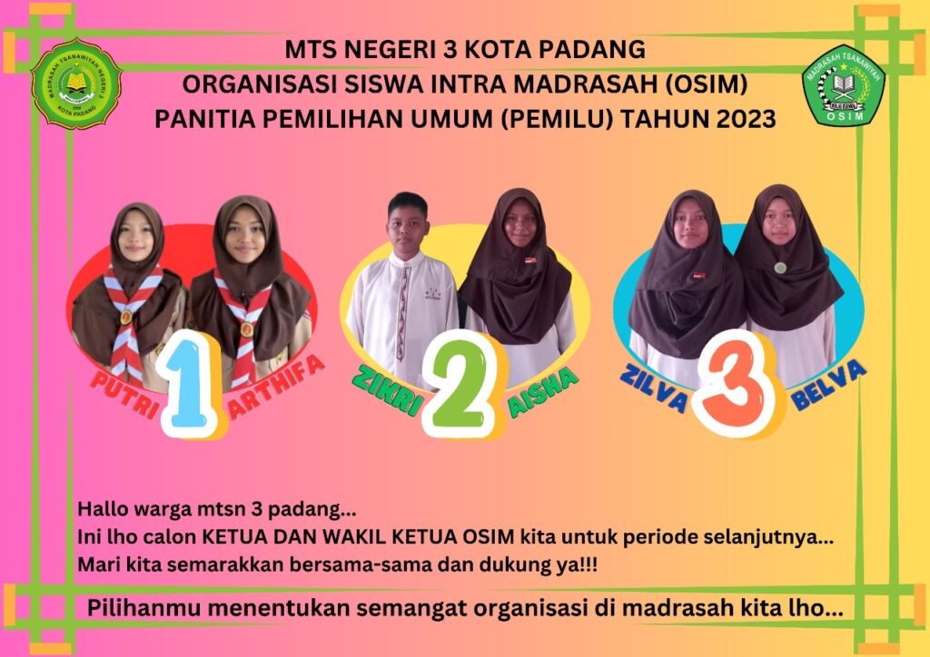 Padang, Humas – Dalam proses demokrasi internal di MTsN 3 Kota Padang, proses pemilihan calon Ketua Organisasi Siswa Intra Madrasah (OSIM) menghasilkan satu kandidat yang berhasil meraih suara tertinggi sejumlah 490 suara, jauh mengungguli kandidat lain yang memperoleh 110 suara dan 42 suara. Kandidat dengan nomor urut satu yaitu Alifah Putri dan Arthifa berhasil memperoleh dukungan luas dari rekan-rekannya, menunjukkan bahwa ia dipercaya untuk memimpin OSIM dalam periode selanjutnya. Kepemimpinan yang diwakili oleh kandidat ini mencerminkan harapan dan kepercayaan yang diberikan oleh anggota OSIM terhadap kemampuan dan visi kepemimpinan yang dimilikinya.