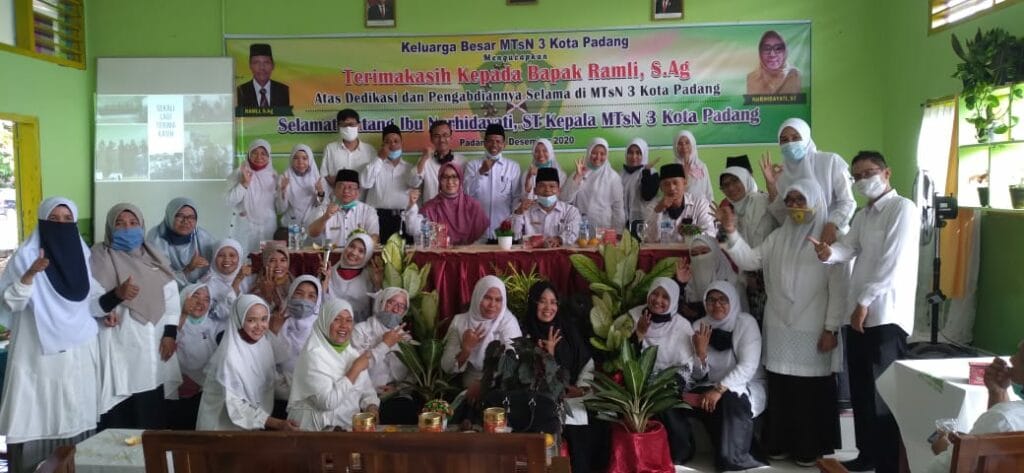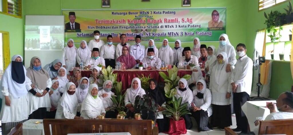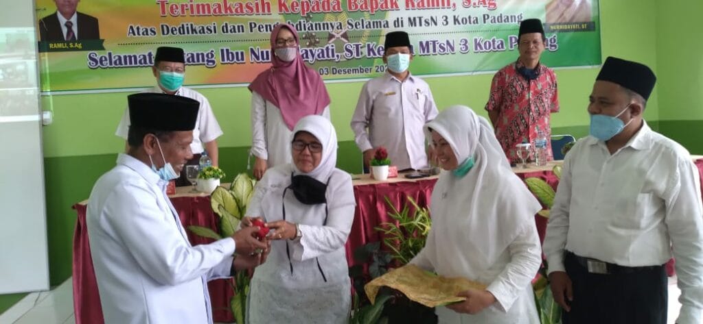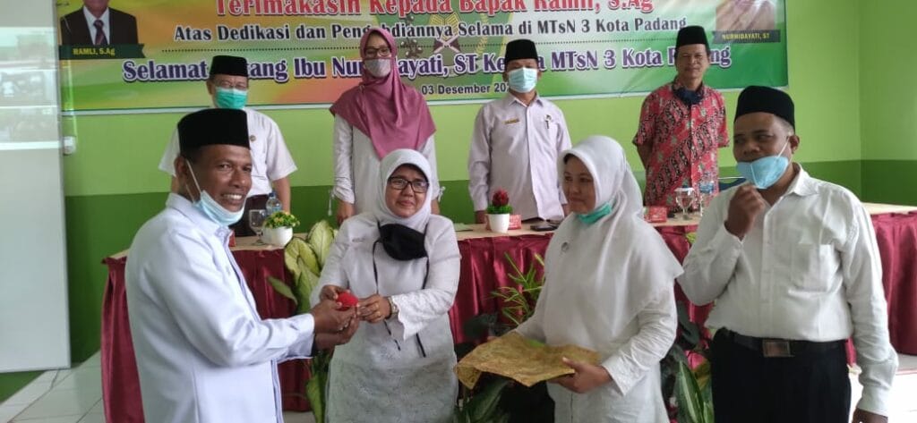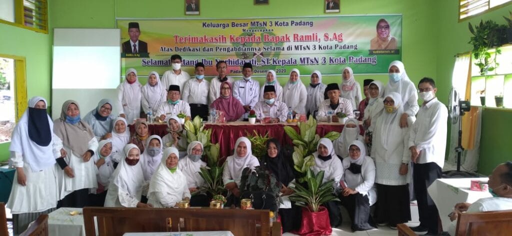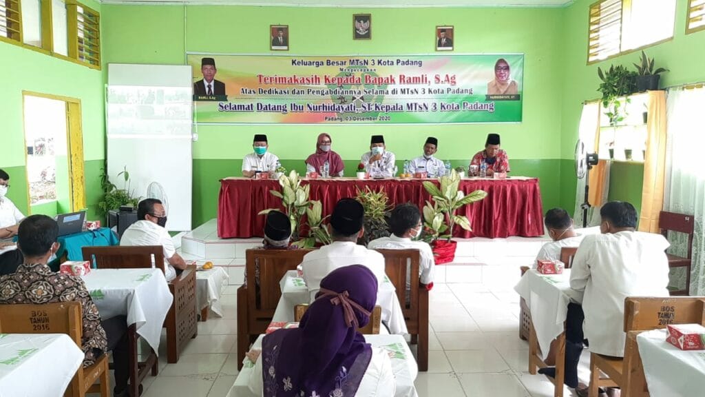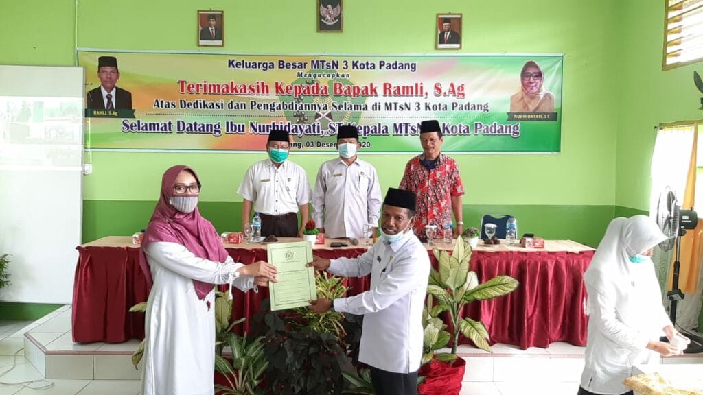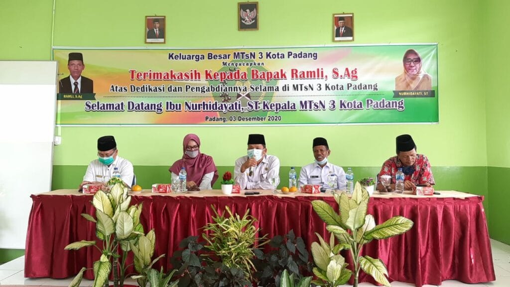 Padang – Pada hari ini Kamis, 3 Desember 2020 dilaksanakan hantaran tugas dan pisah sambut dari Plt. Kepala Ramli, S.Ag ke Kepala Definitif Nurhidayati, S.T di ruangan aula MTsN 3 Kota Padang. Hantaran tugas Kepala MTsN 3 Kota Padang yang baru ini dilakukan setelah dilakukan pelantikan oleh Kakan Kemenag Kota Padang Bapak Drs. H. Marjanis, M.Pd di Aula Kemenag Kota Padang.