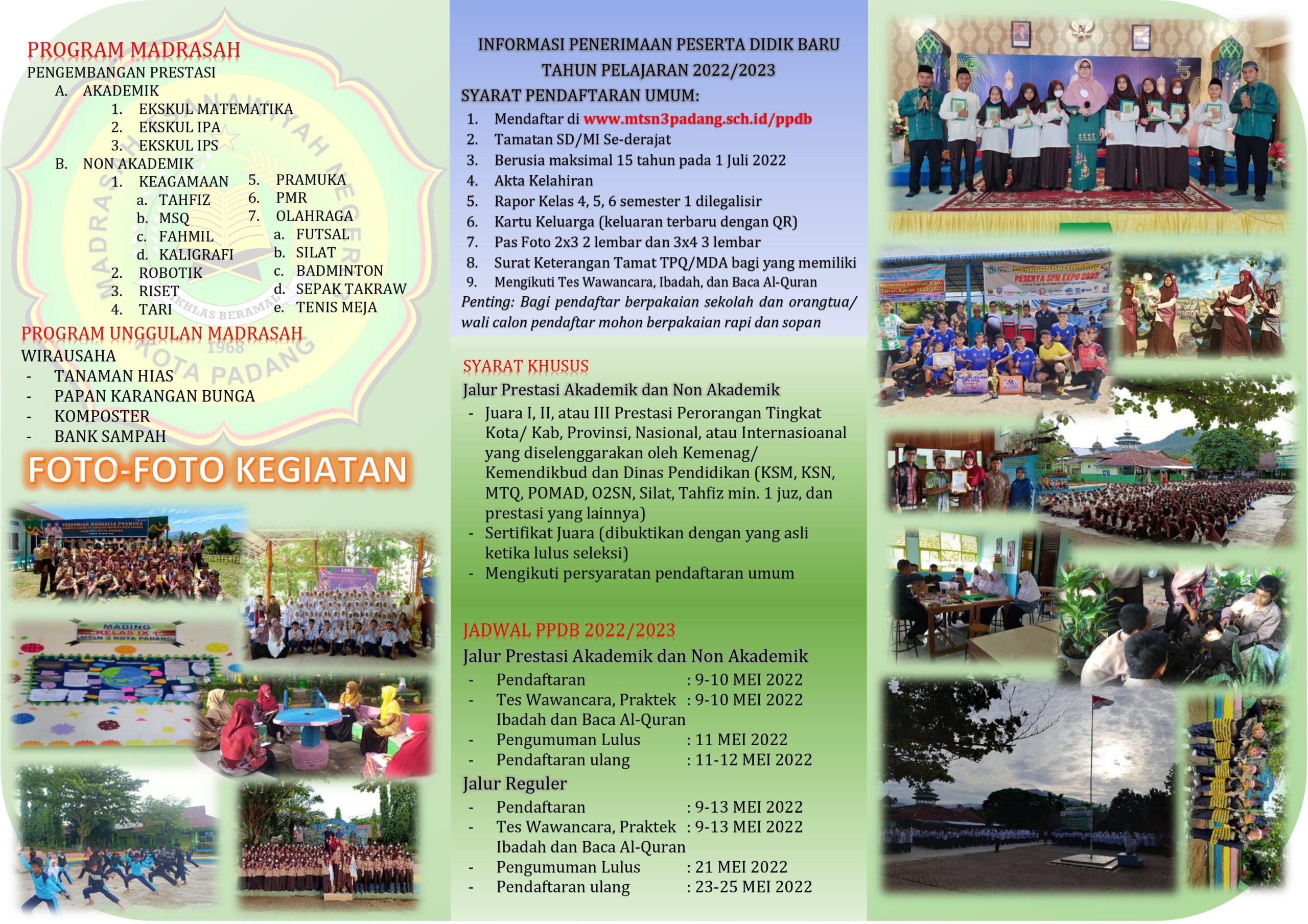 Padang Humas- MTsN 3 Kota Padang buka Pendafaran Peserta Didik Baru (PPDB) tahun pelajaran 2022/2023 melalui dua jalur yakni Prestasi dan Reguler.