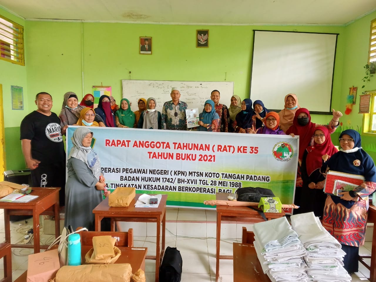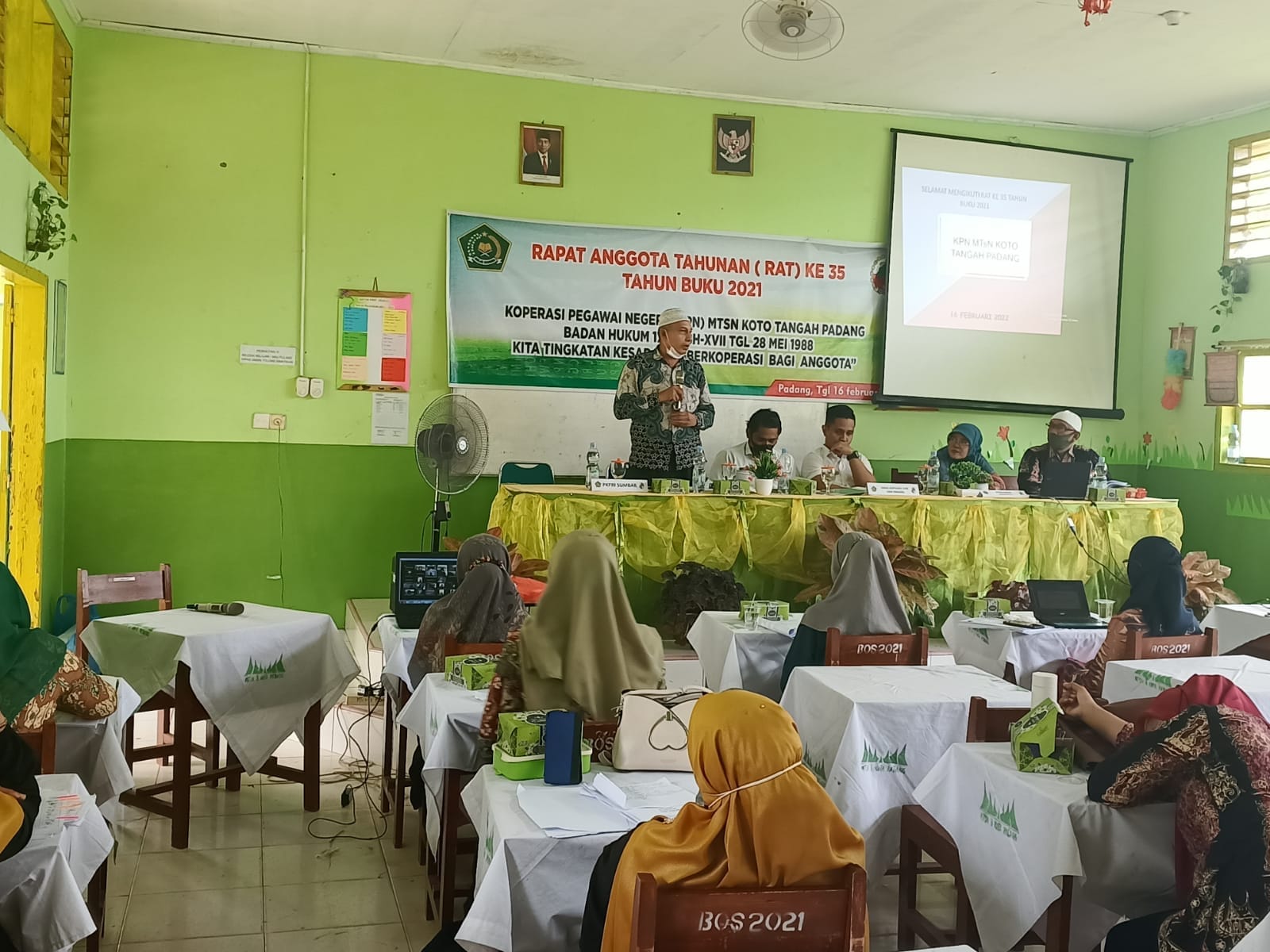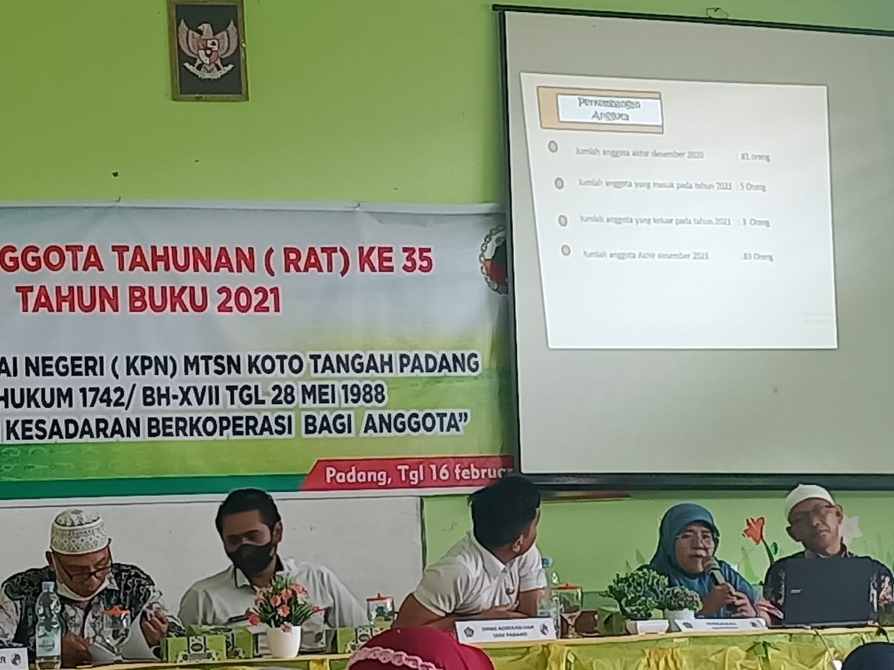 Rapat Anggota Tahunan (RAT) Koperasi MTsN Koto Tangah tahun buku 2021 tersebut dihadiri oleh unsur pimpinan, pengawas, pengurus, dan anggota.