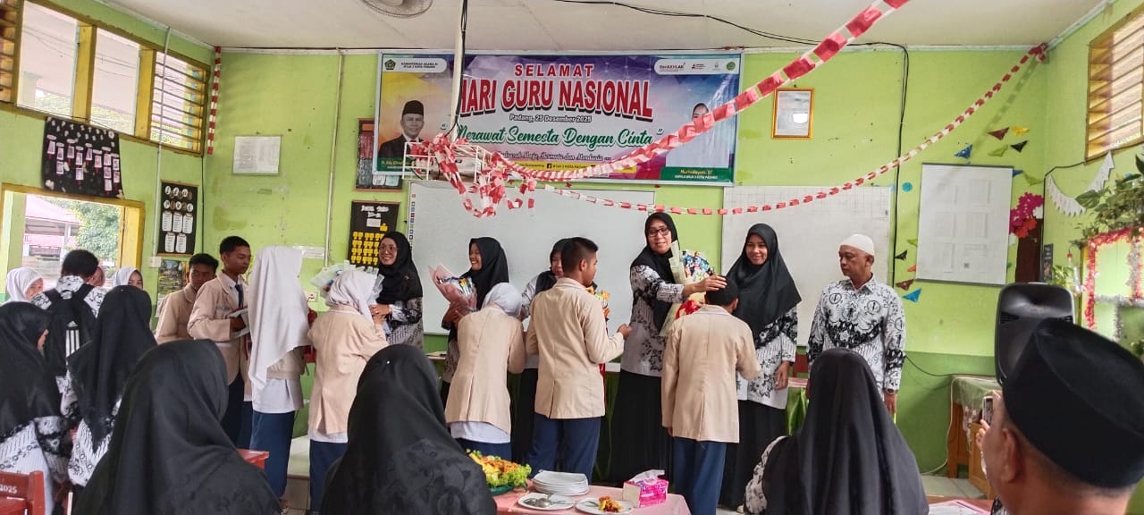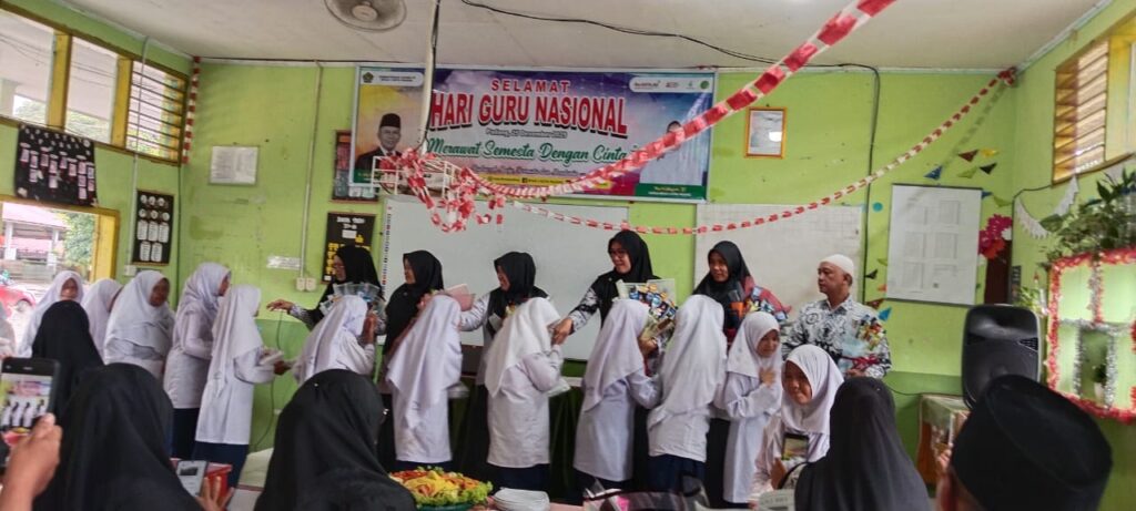 Padang, Humas – Sebagai bagian dari peringatan Hari Guru Nasional (HGN) Tahun 2025, siswa MTsN 3 Kota Padang menggelar rangkaian ucapan selamat dan ungkapan terima kasih kepada para guru di ruang pertemuan madrasah pada Selasa, 25 November 2025. Setelah sesi resmi dan pemberian reward kepada GTK berprestasi, suasana berubah menjadi lebih hangat dan emosional ketika para siswa diberi kesempatan menyampaikan rasa hormat mereka kepada guru. Ucapan selamat disampaikan dalam berbagai cara, mulai dari kata-kata langsung, kartu ucapan sederhana, hingga persembahan kecil yang sarat makna kebersamaan.