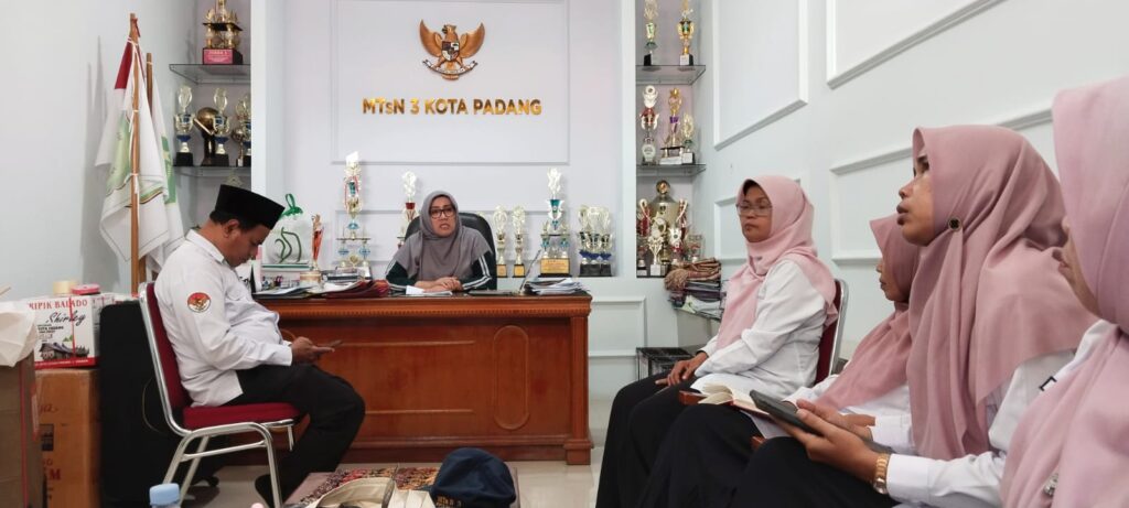 Padang, Humas – MTsN 3 Kota Padang menggelar rapat koordinasi unsur pimpinan pada Senin (3/11/2025) di ruang kepala madrasah. Kegiatan ini bertujuan memperkuat sinergi antarbagian dalam mendukung pelaksanaan program madrasah serta memberikan dukungan penuh bagi siswa yang akan mengikuti ajang tingkat nasional. Rapat dipimpin oleh Kepala Madrasah bersama para wakil kepala dan koordinator program yang membahas strategi pencapaian target madrasah di bidang akademik maupun nonakademik.