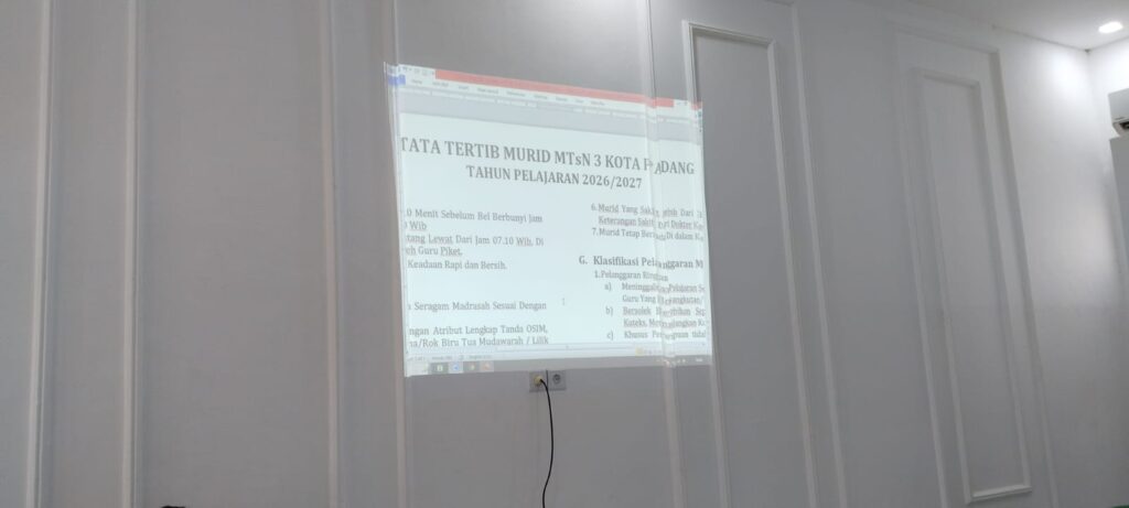 Padang, Humas – MTsN 3 Kota Padang menggelar rapat revisi Tata Tertib Murid pada Rabu, 11 Februari 2026, pukul 10.00 WIB bertempat di Ruang Bimbingan dan Konseling (BK). Kegiatan ini dilaksanakan sebagai bagian dari persiapan penyusunan dokumen madrasah untuk Tahun Pelajaran 2026/2027. Rapat diikuti oleh unsur pimpinan madrasah, tim kesiswaan, guru BK, serta perwakilan dewan guru yang terlibat dalam perumusan dan penyempurnaan aturan kedisiplinan siswa.