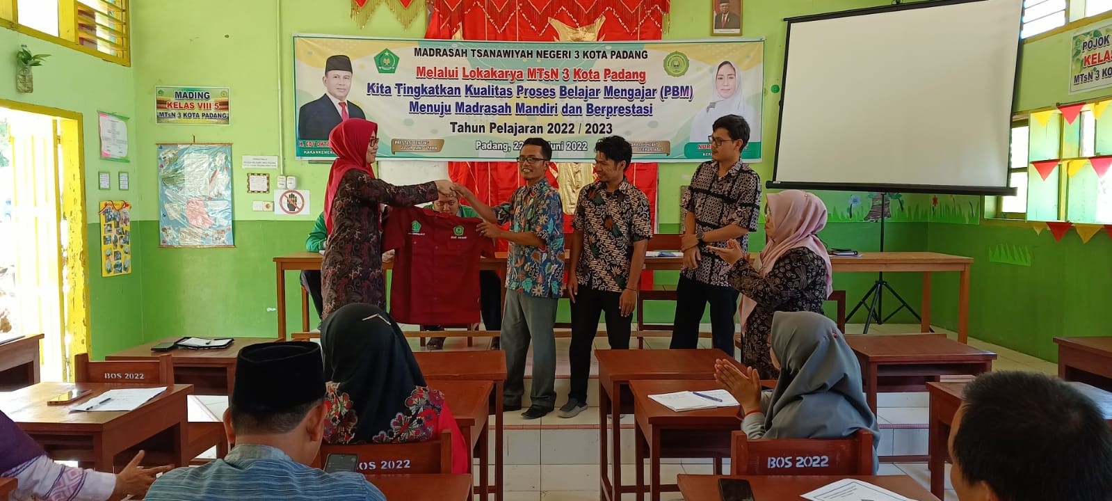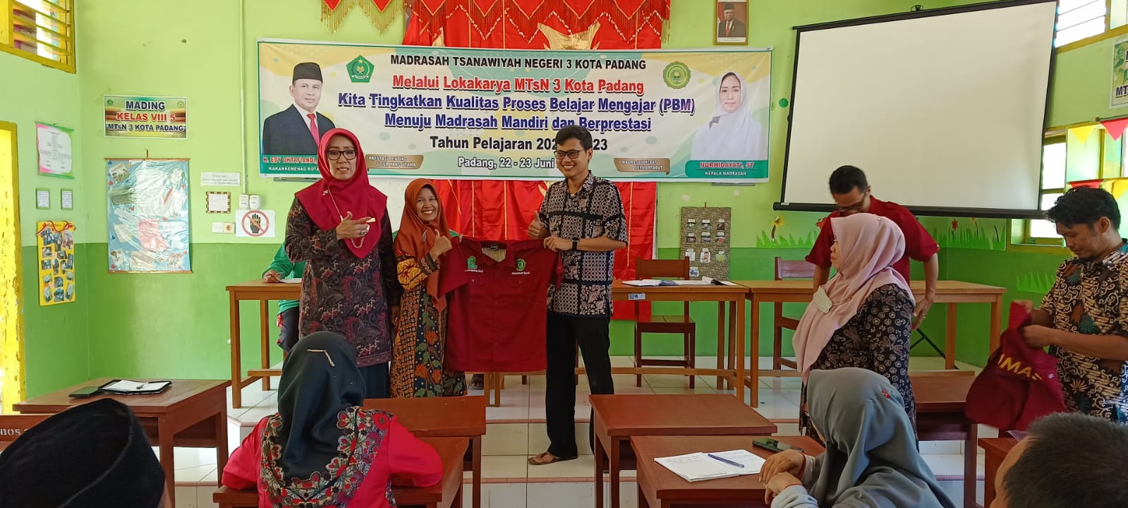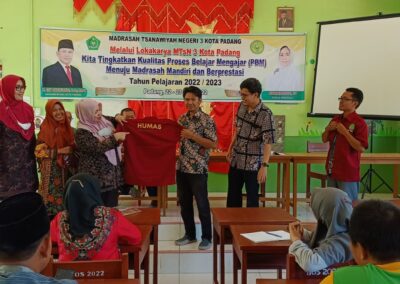Waka Humas Ahdi Ahmad mengucapkan terima kasih kepada Kepala MTsN 3 Kota Padang yang telah memberikan seragam humas baru kepada Tim Humas MTsN 3 Kota Padang. (AA. Foto : AA)
