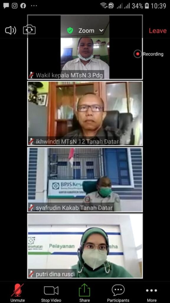 Padang, Humas – Wakil Kepala Bidang Humas mewakili Kepala MTsN 3 Kota Padang mengikuti Zoom Meeting dengan acara sosialisasi JKN-KIS kerjasama dengan Kementerian Agama se-Propinsi Sumatera Barat yang diadakan pada hari Senin, 6 September 2021 dengan narasumber Kepala BPJS Kota Padang. Dalam pemaparannya pembiayaan BPJS yang ditanggung hanya 1% melalui DIPA, sedangkan 4% diusahakan ditanggung oleh Kementerian. (SS. Foto : SS)
