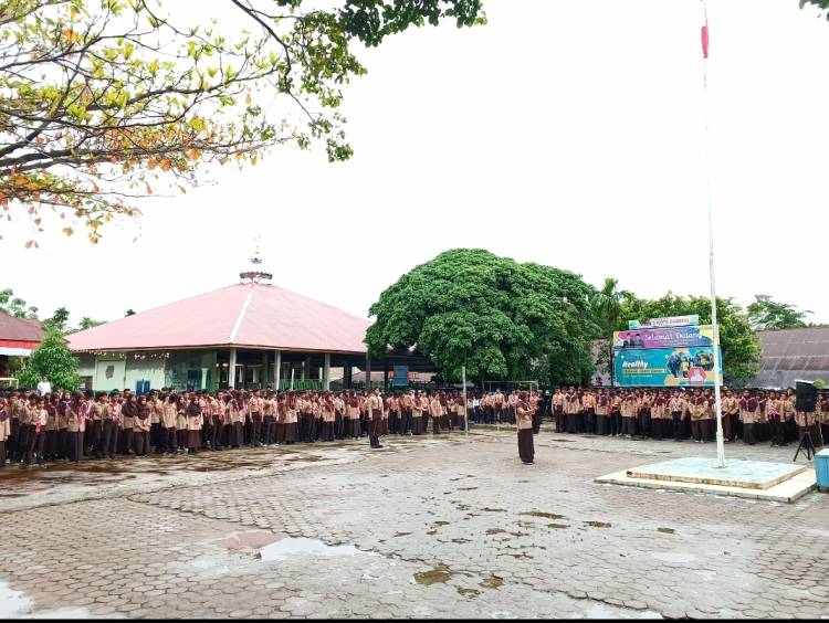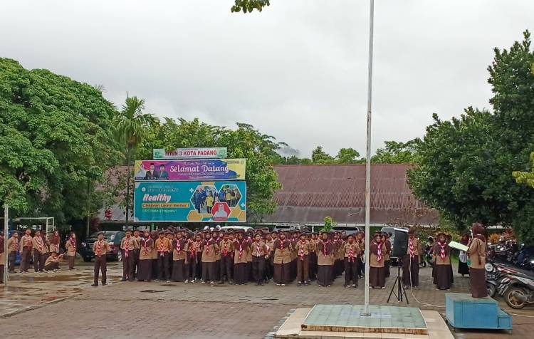 Padang, Humas – Salam Pramuka, Rahmat Allah yaitu hujan yang tercurah sedari pagi tadi menyelimuti Kota Padang tidak menurunkan semangat warga MTsN 3 Kota Padang dalam memperingati hari Pramuka ke-62 Indonesia di lapangan upacara madrasah, Senin (14/08).