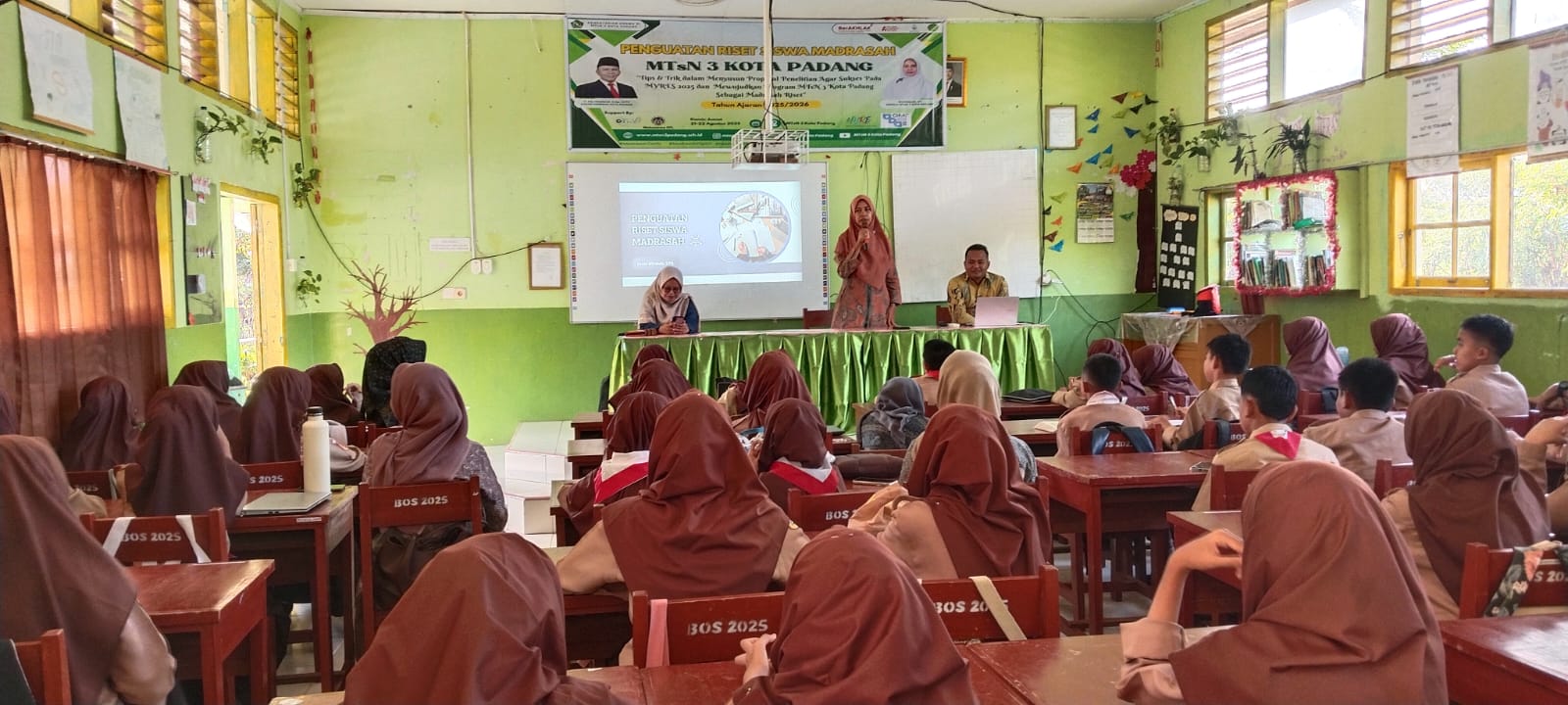 Padang, Humas – MTsN 3 Kota Padang melalui Tim Riset Madrasah melaksanakan kegiatan Penguatan Riset Siswa Madrasah pada Kamis–Jumat, 21–22 Agustus 2025. Kegiatan ini digelar dalam rangka persiapan menghadapi ajang Olimpiade Madrasah Indonesia (OMI) bidang Myres dengan tema “Tips & Trik dalam Menyusun Proposal Penelitian agar Sukses Myres Tahun 2025 Mewujudkan MTsN 3 Kota Padang sebagai Madrasah Riset”. Pemateri dalam kegiatan ini adalah Bapak Detra Wiranda, S.Pd, yang menyampaikan berbagai strategi praktis agar siswa dapat menghasilkan proposal penelitian yang layak bersaing di tingkat nasional.