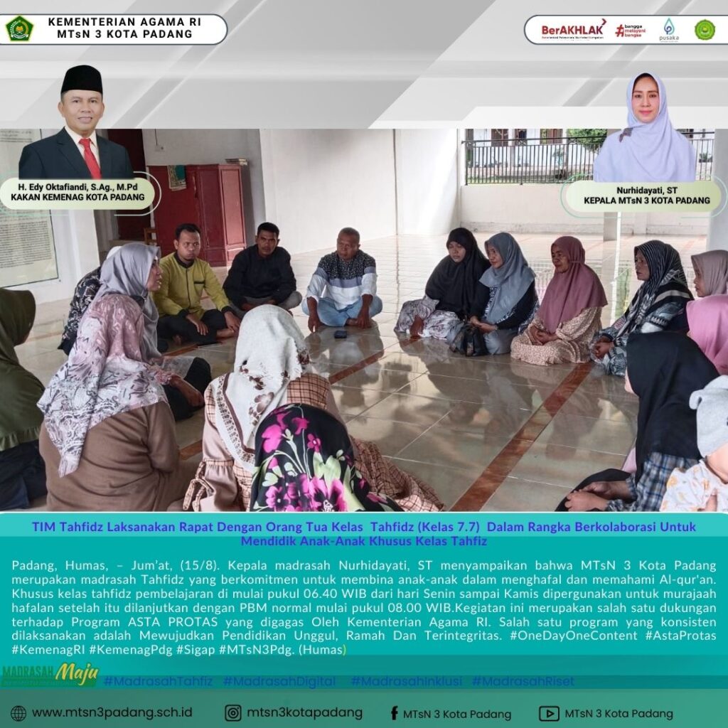 Padang, Humas – Jumat, 15 Agustus 2025, Tim Tahfidz MTsN 3 Kota Padang melaksanakan rapat bersama orang tua siswa kelas 7.7 yang merupakan kelas khusus Tahfidz. Pertemuan yang berlangsung di lingkungan madrasah ini dipimpin langsung oleh Kepala MTsN 3 Kota Padang, Nurhidayati, ST, dan dihadiri oleh wali kelas serta guru pembimbing Tahfidz. Agenda rapat membahas strategi dan komitmen bersama dalam membina anak-anak agar mampu menghafal dan memahami Al-Qur’an secara optimal.