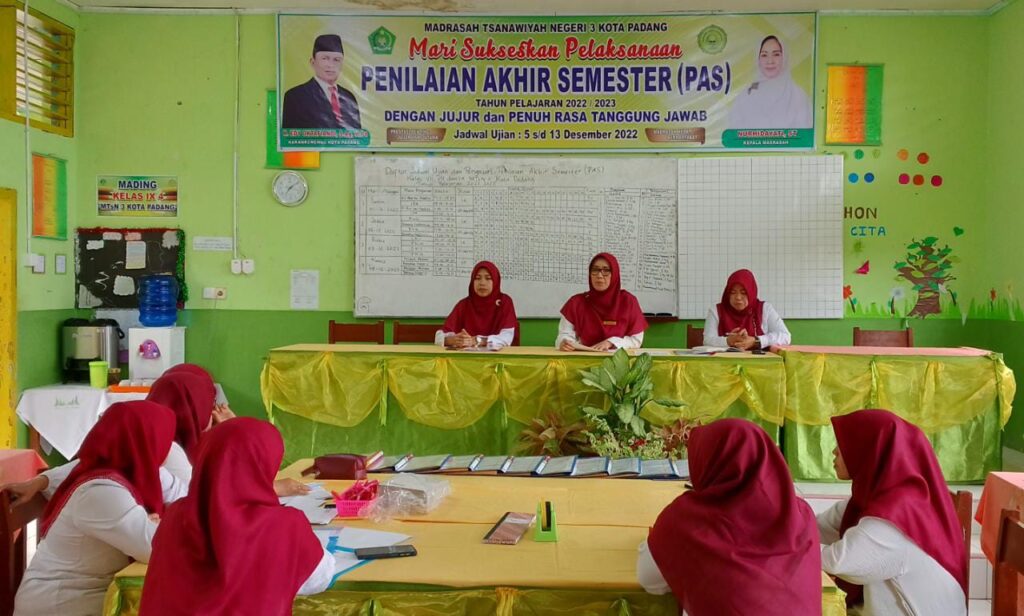 Padang, Humas – Kepala MTsN 3 Kota Padang, Nurhidayati melakukan briefing pengawas ruang Penilaian Akhir Semester (PAS) Ganjil 2022-2023 tentang tata tertib pelaksanaan ujian, Senin (5/12) di ruang panitia ujian.